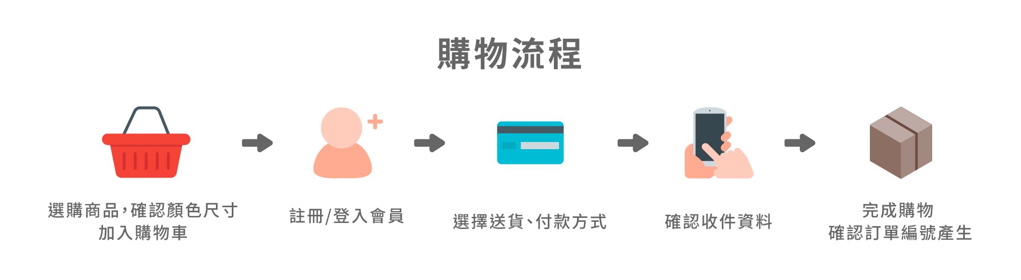 將喜愛的商品加入購物車→進入購物車點選前往結帳→登入/註冊會員→選擇結帳方式→確認收件資料→完成購物並確認訂單編號產生