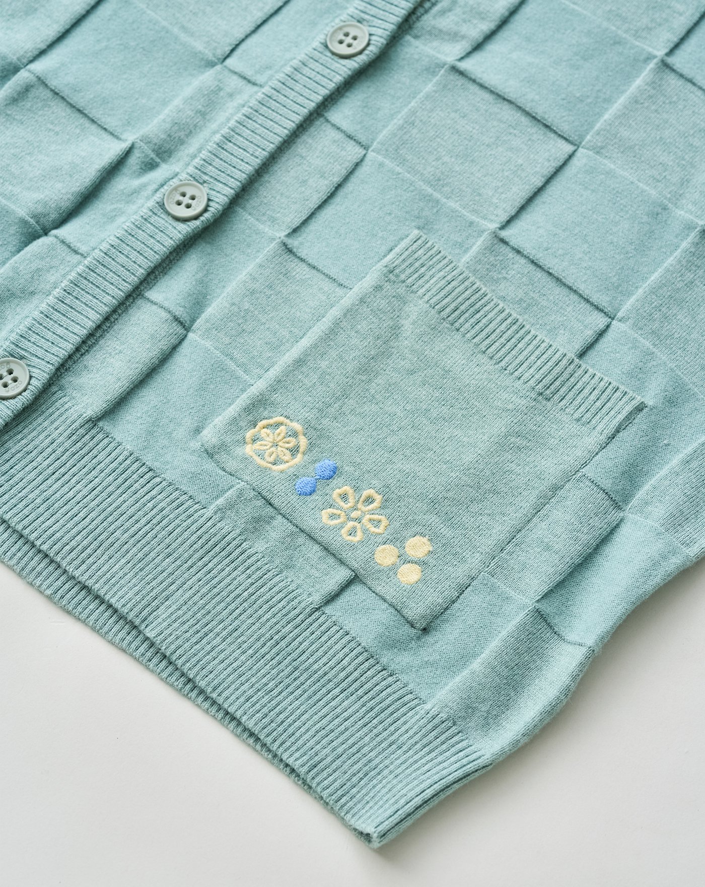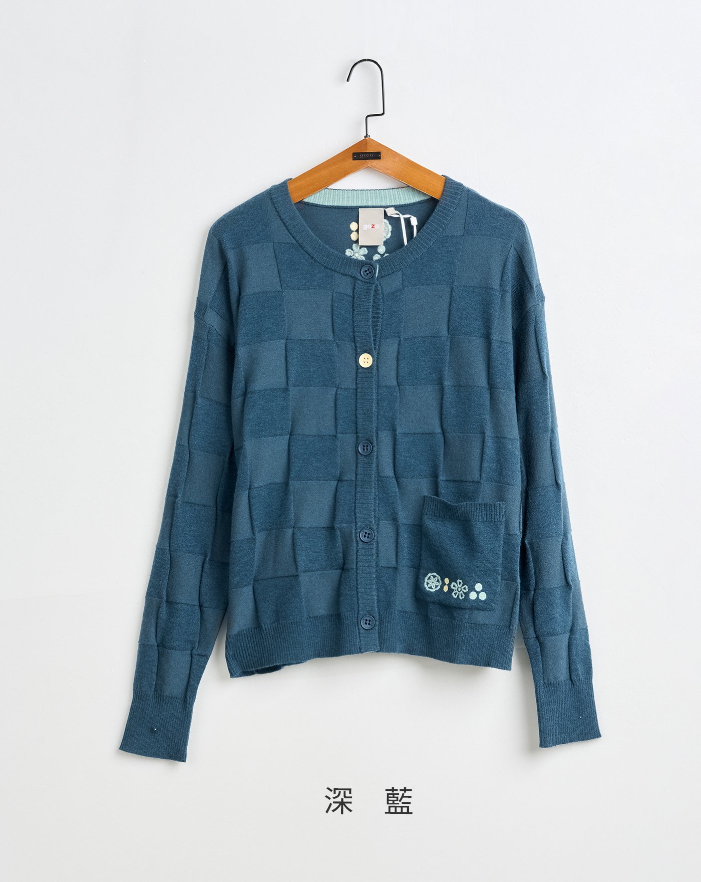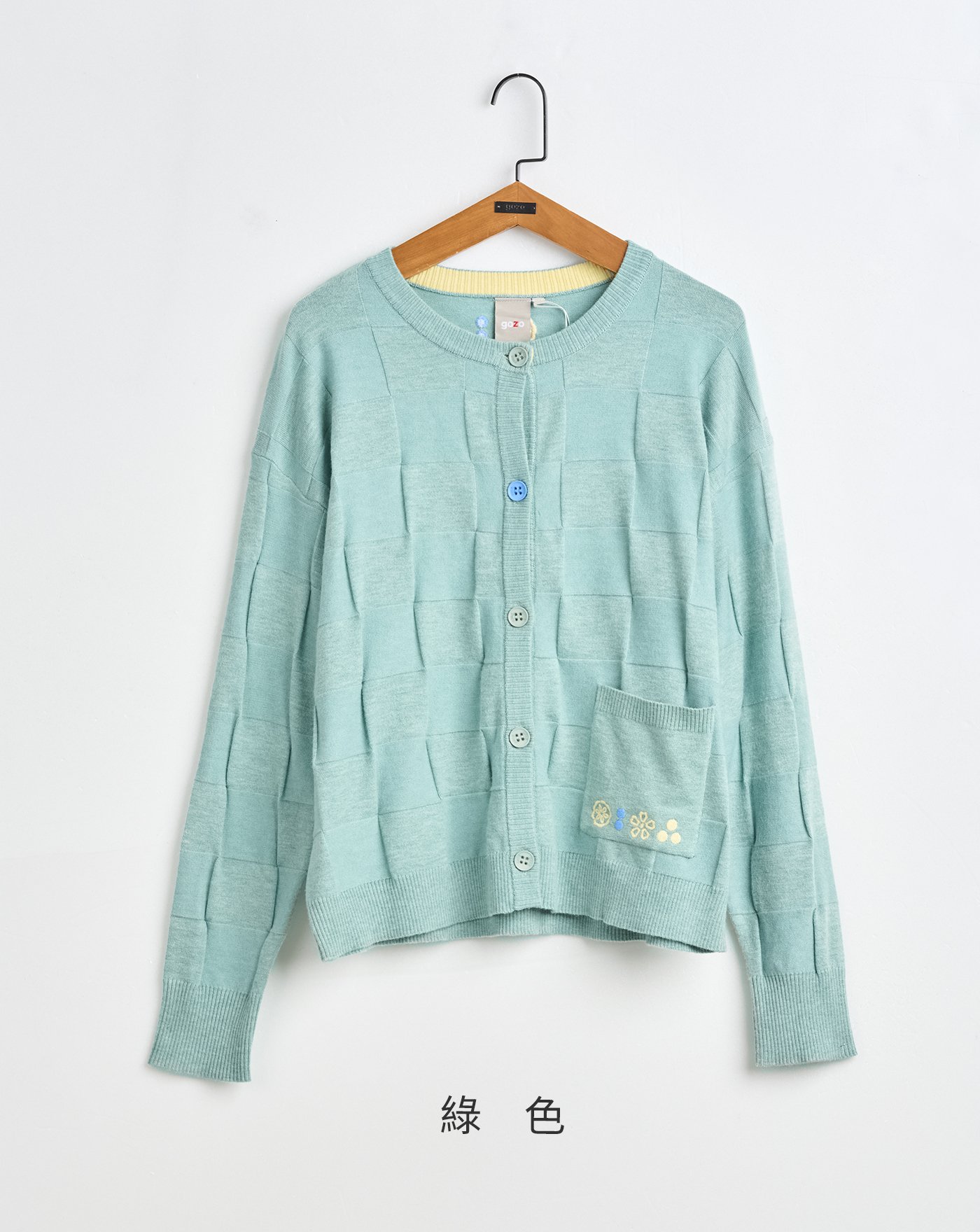 棋盤格毛衣外套微落肩修身小版型領口/扣子配色口袋圖案:糕餅阿嬤的摩斯密碼(綠豆椪的小紅點點)親膚澳絨毛/柔軟親膚面感,細紗薄款不厚重