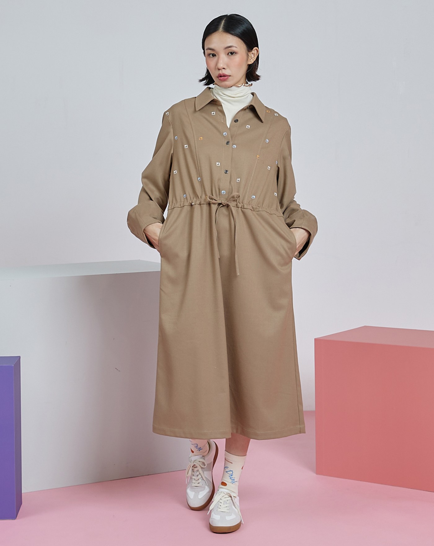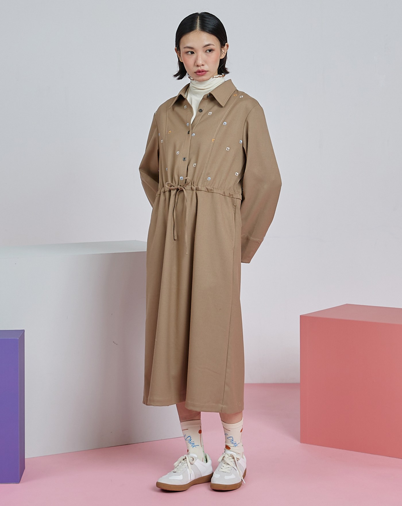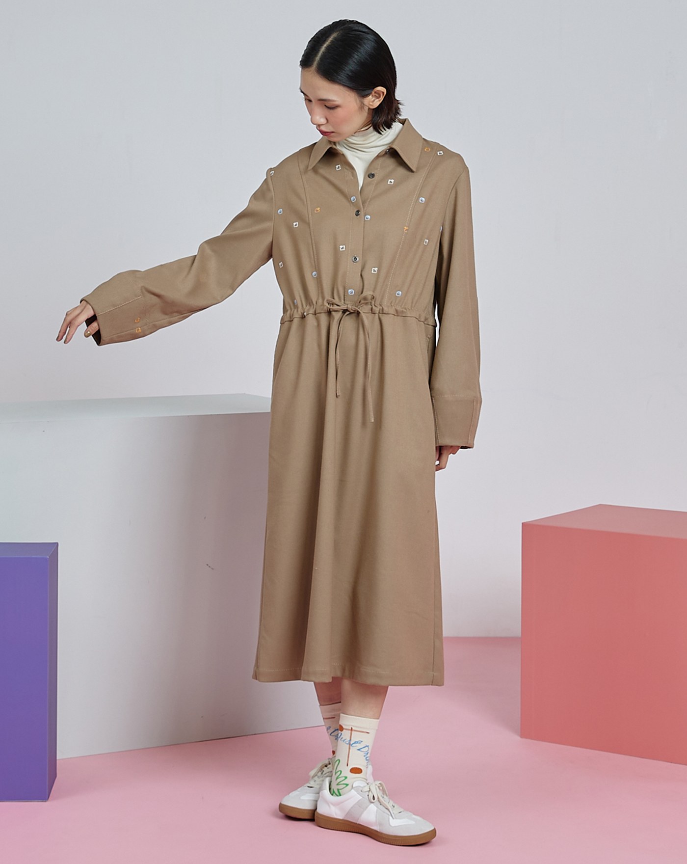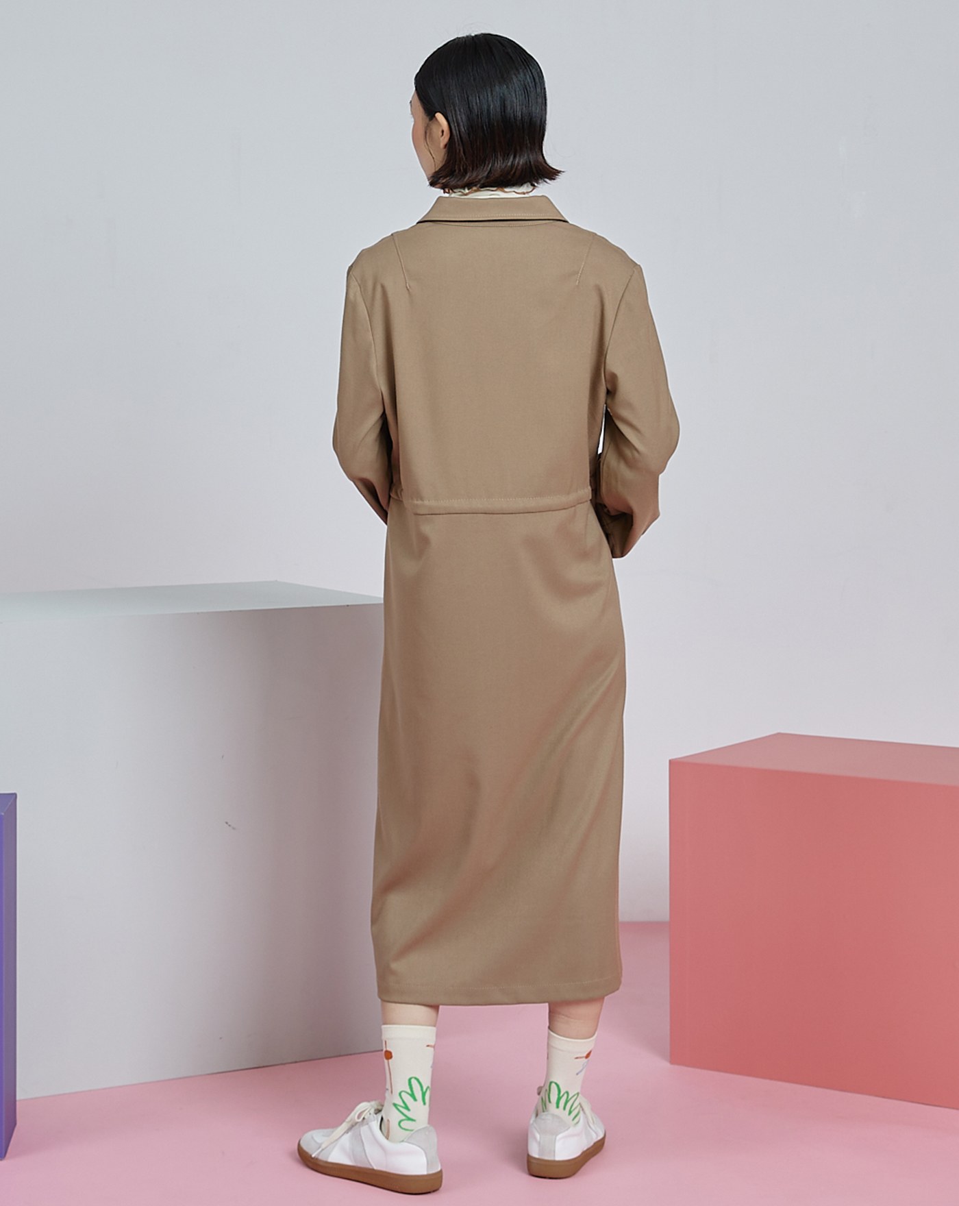 天絲暗條紋抽繩袖開襟洋裝(兩色)