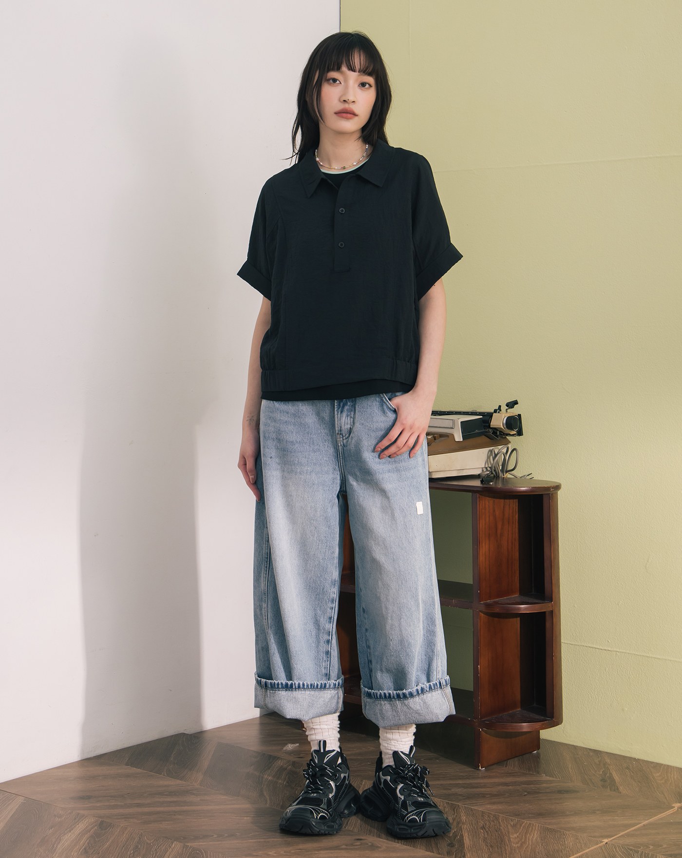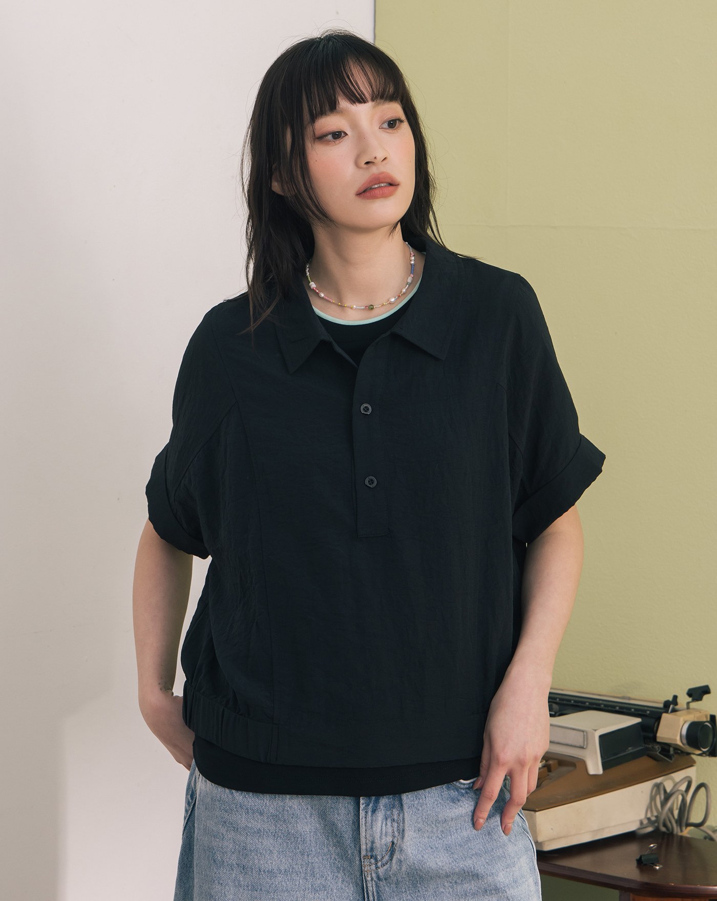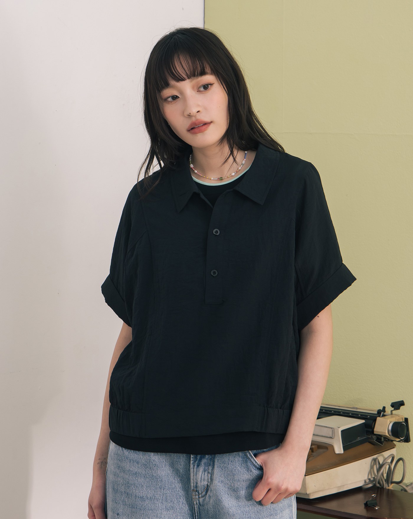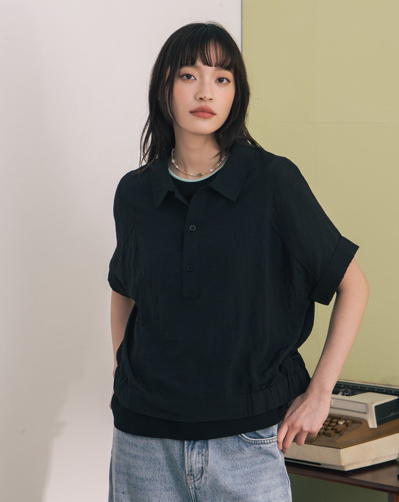 ➤配色鈕扣開襟連袖上衣(兩色)