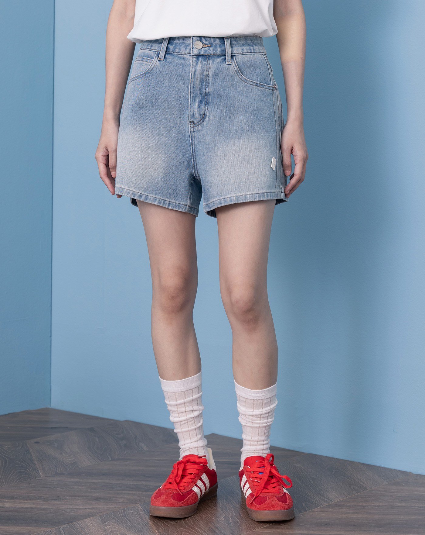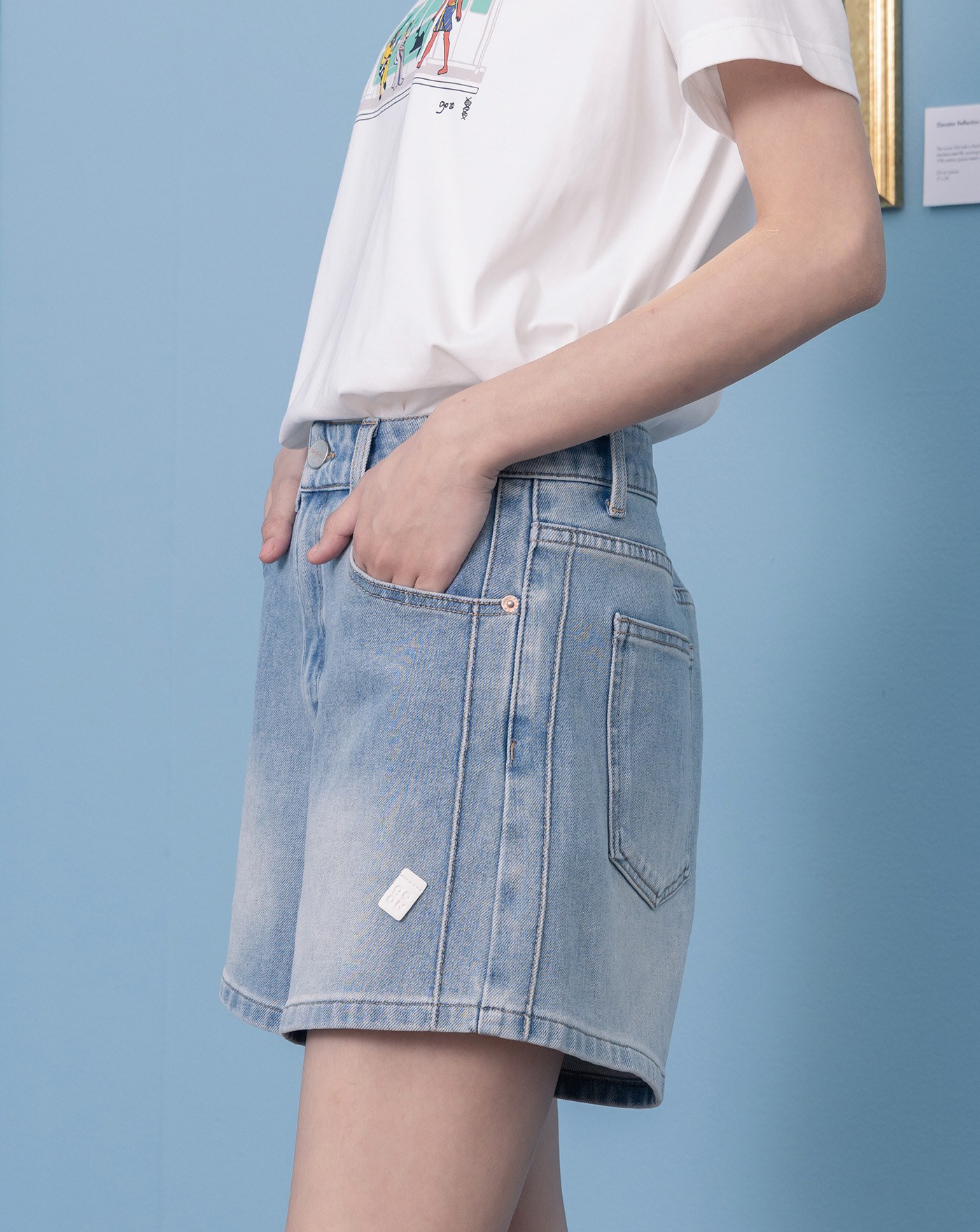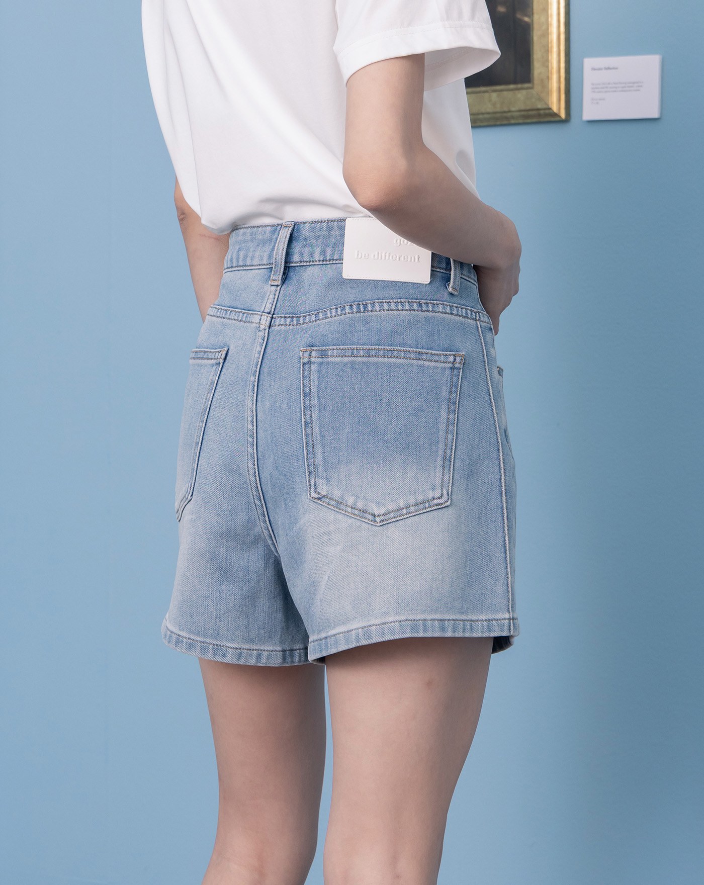 顯瘦斜邊剪裁皮標A字牛仔短裙