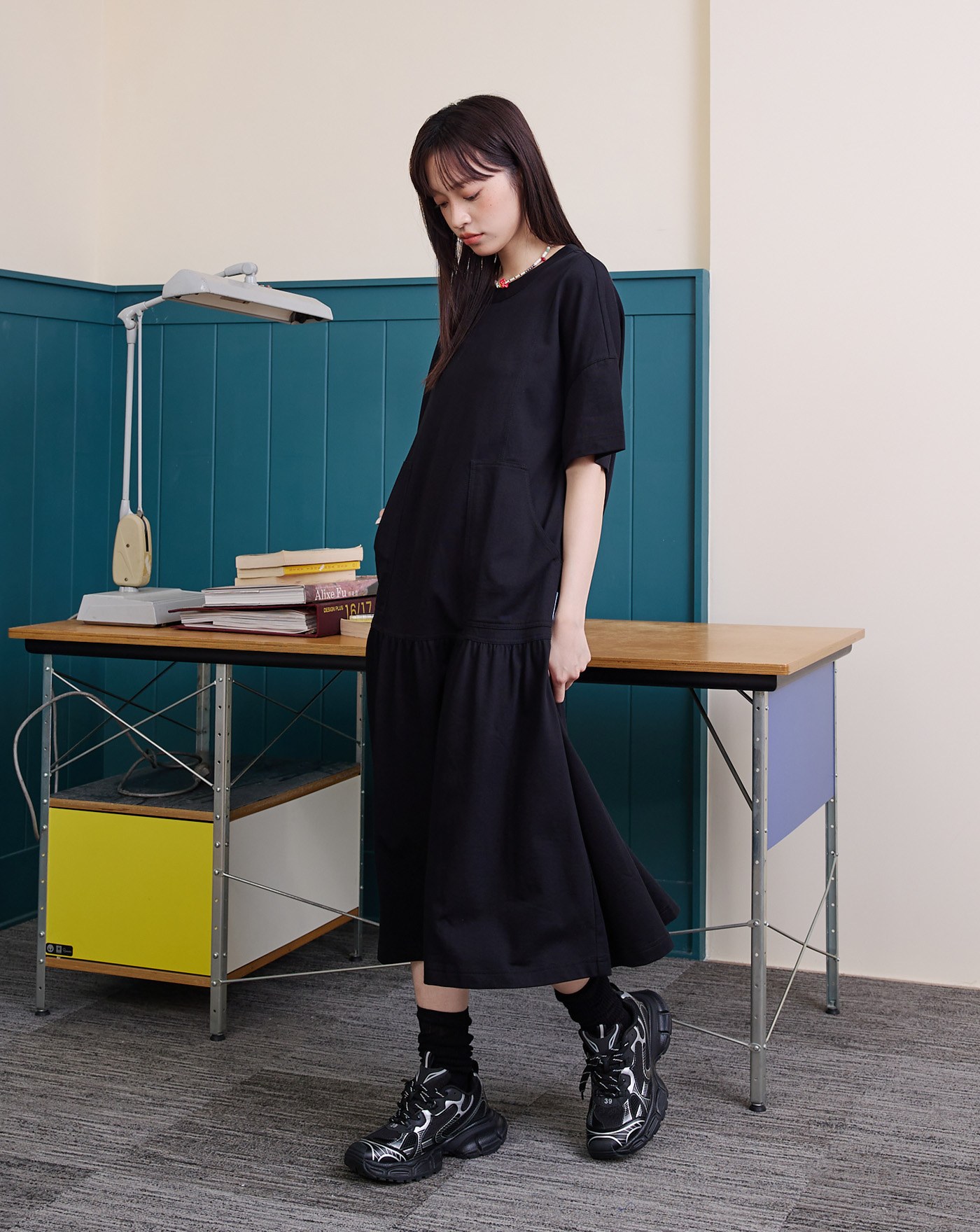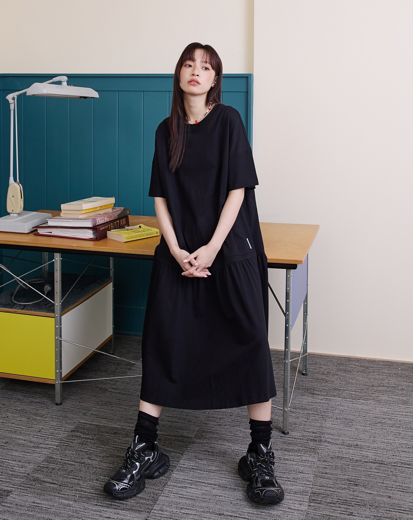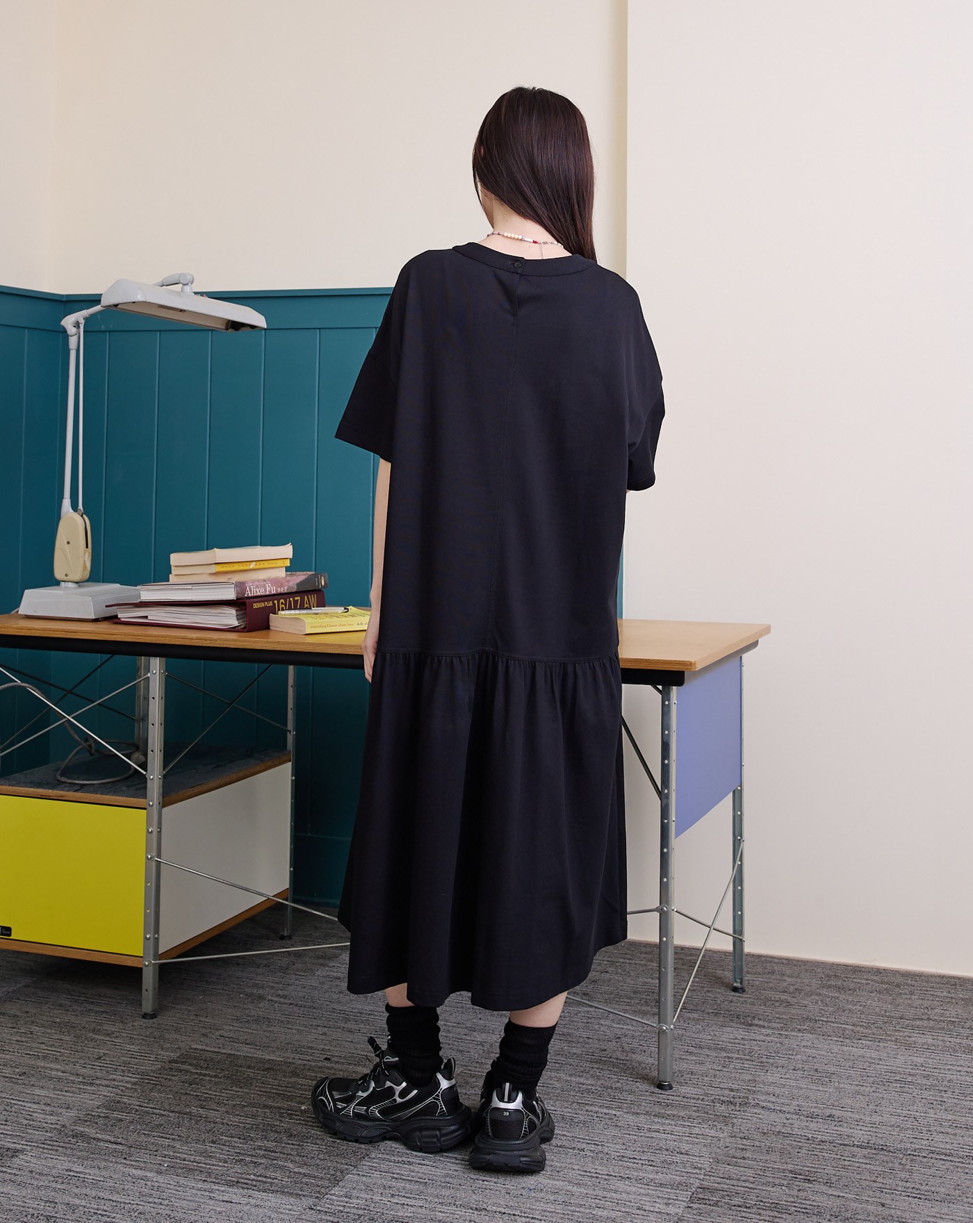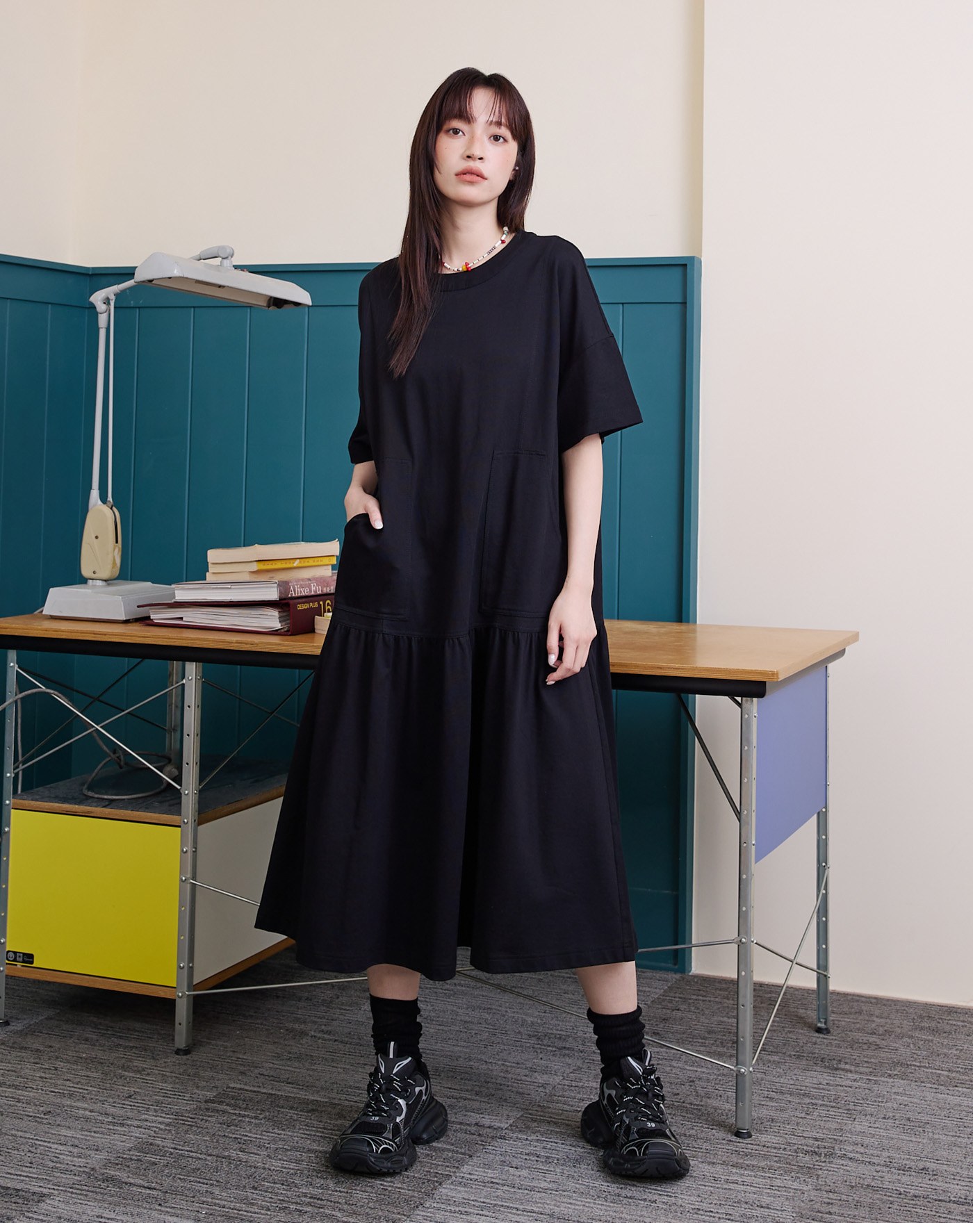 ➤顯瘦抓褶收腰圓領短袖洋裝(兩色)