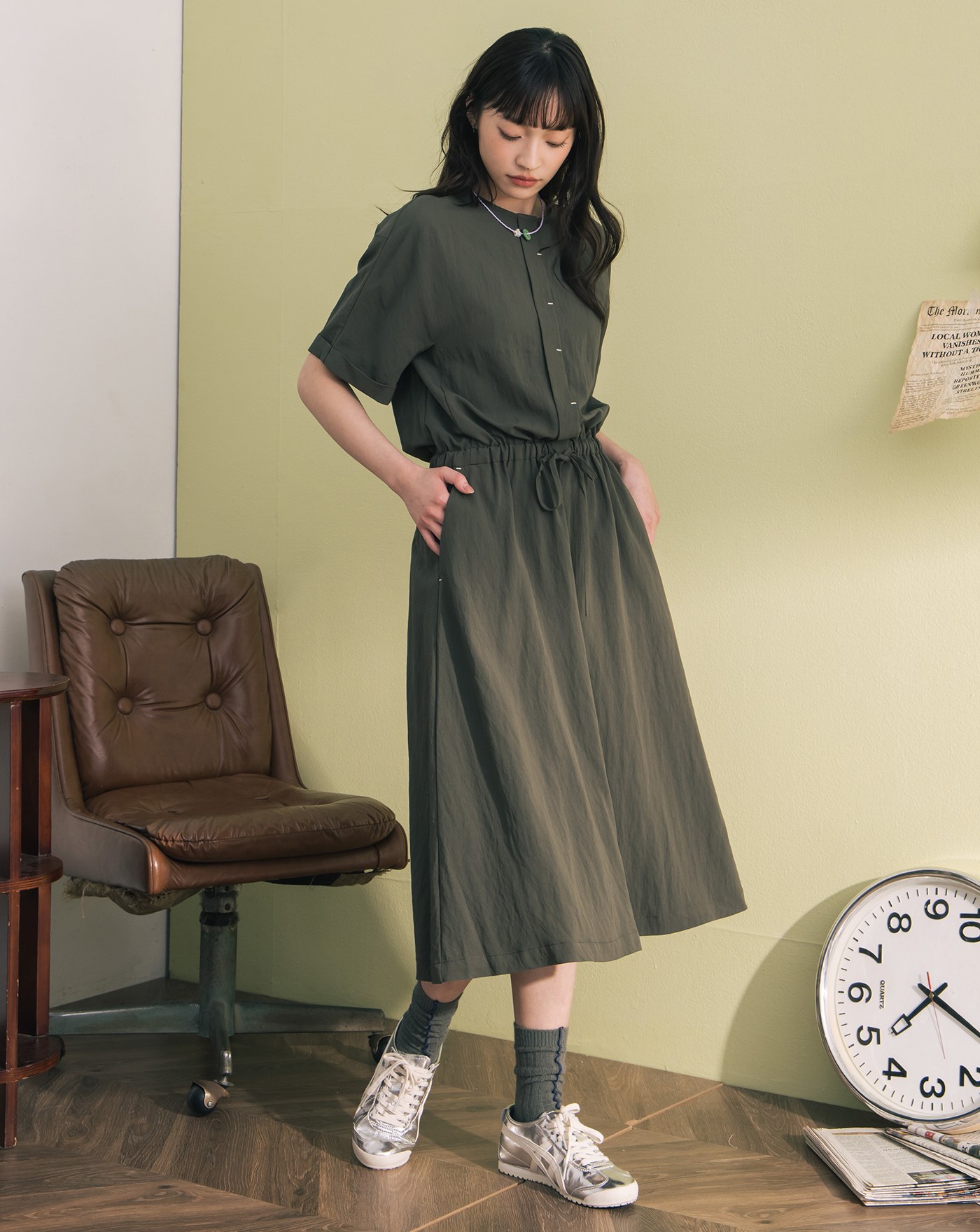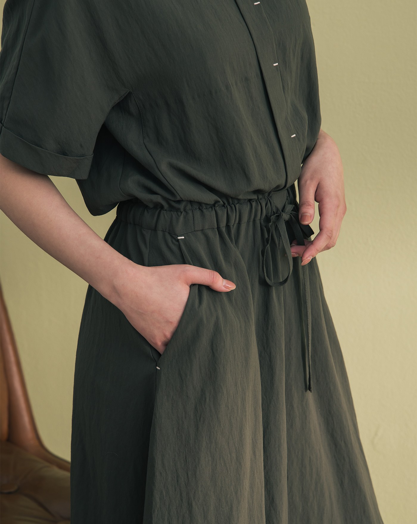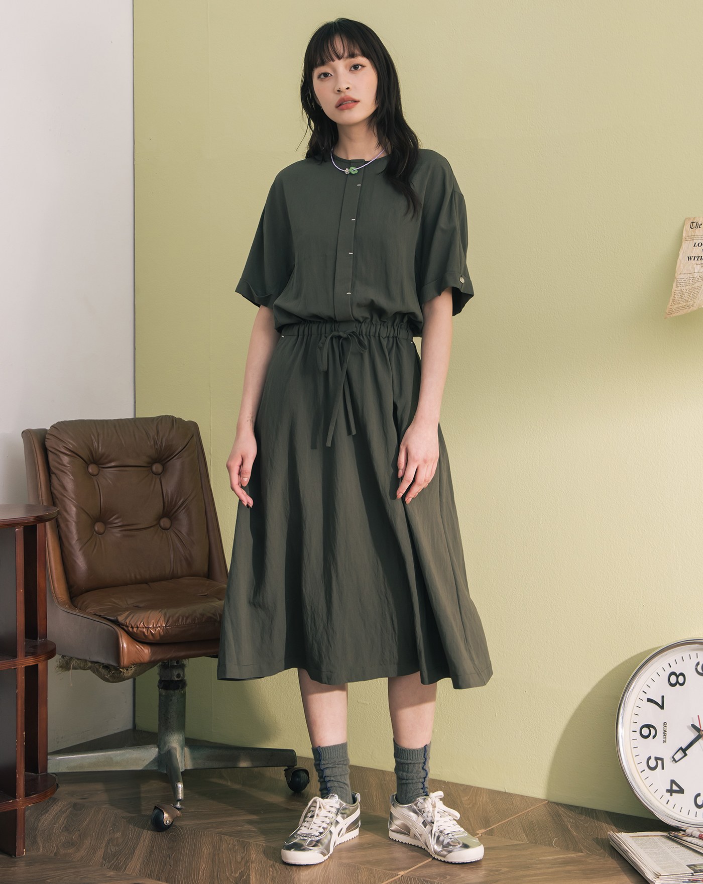 ➤顯瘦抓褶半開襟短袖洋裝(兩色)