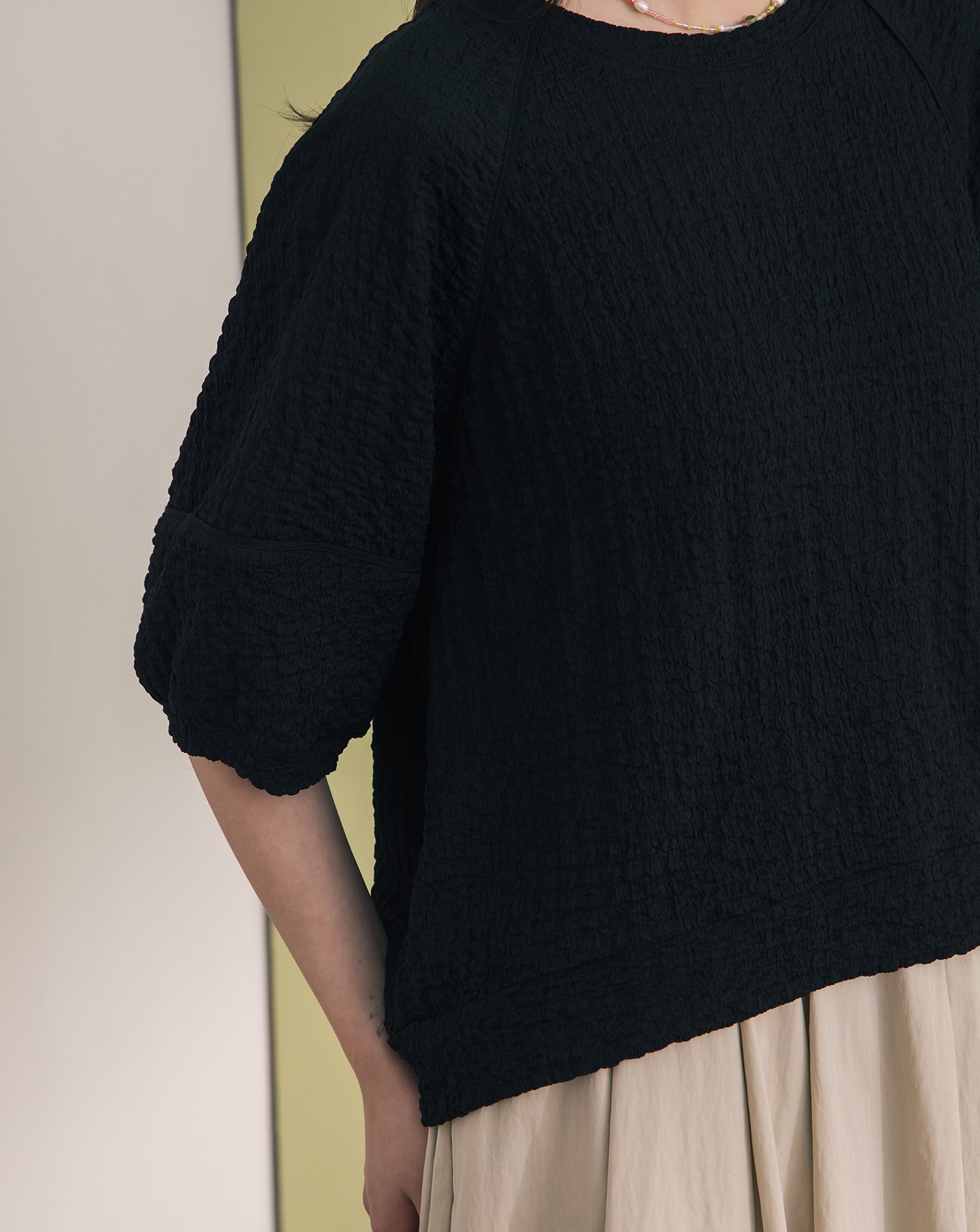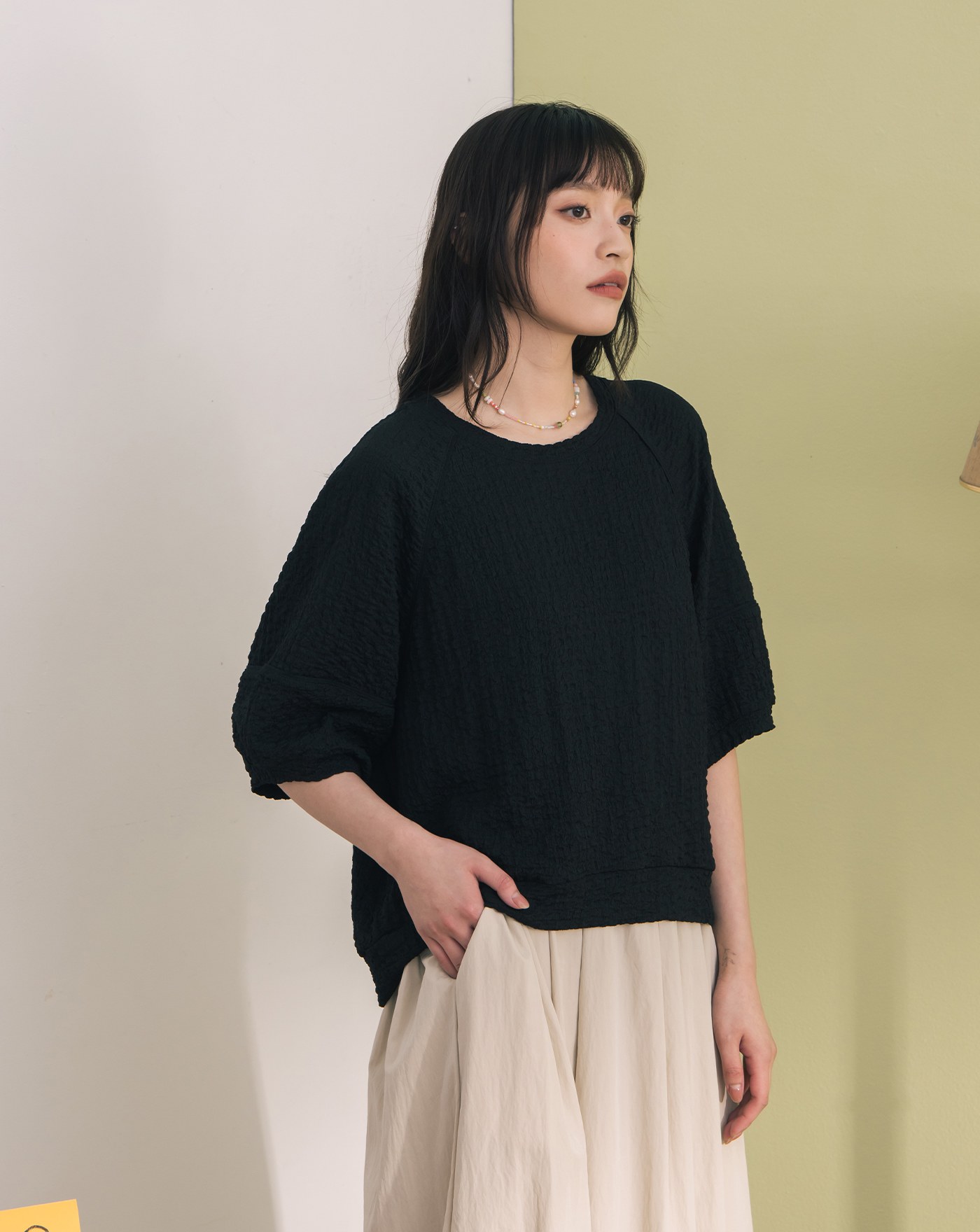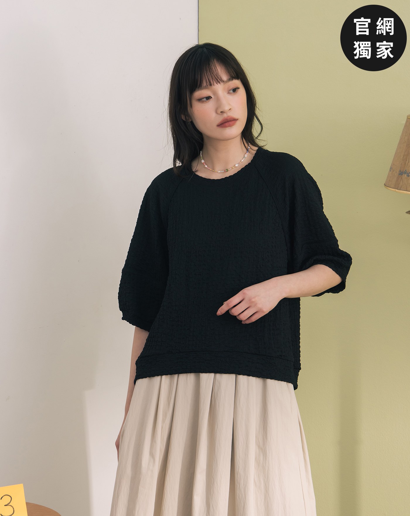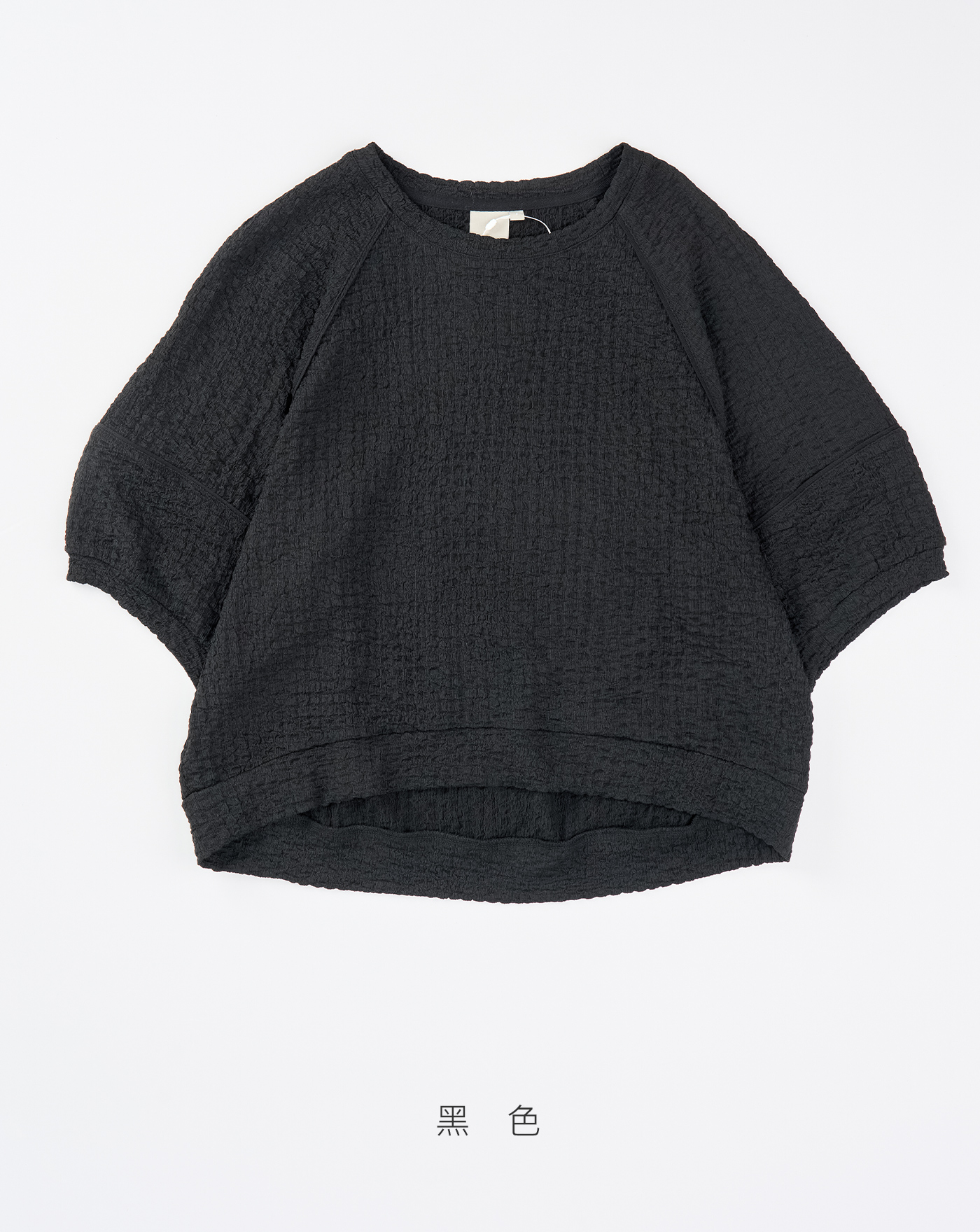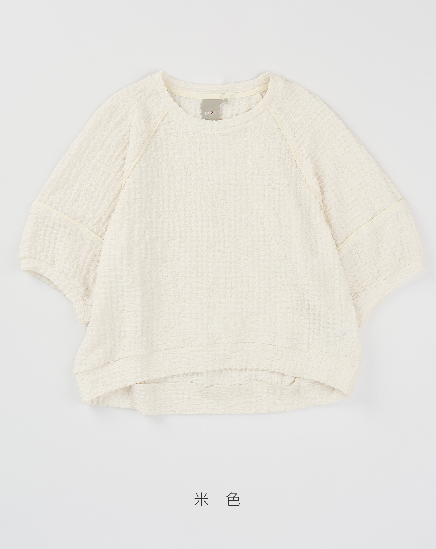 ➤配色壓線七分澎袖涼感上衣