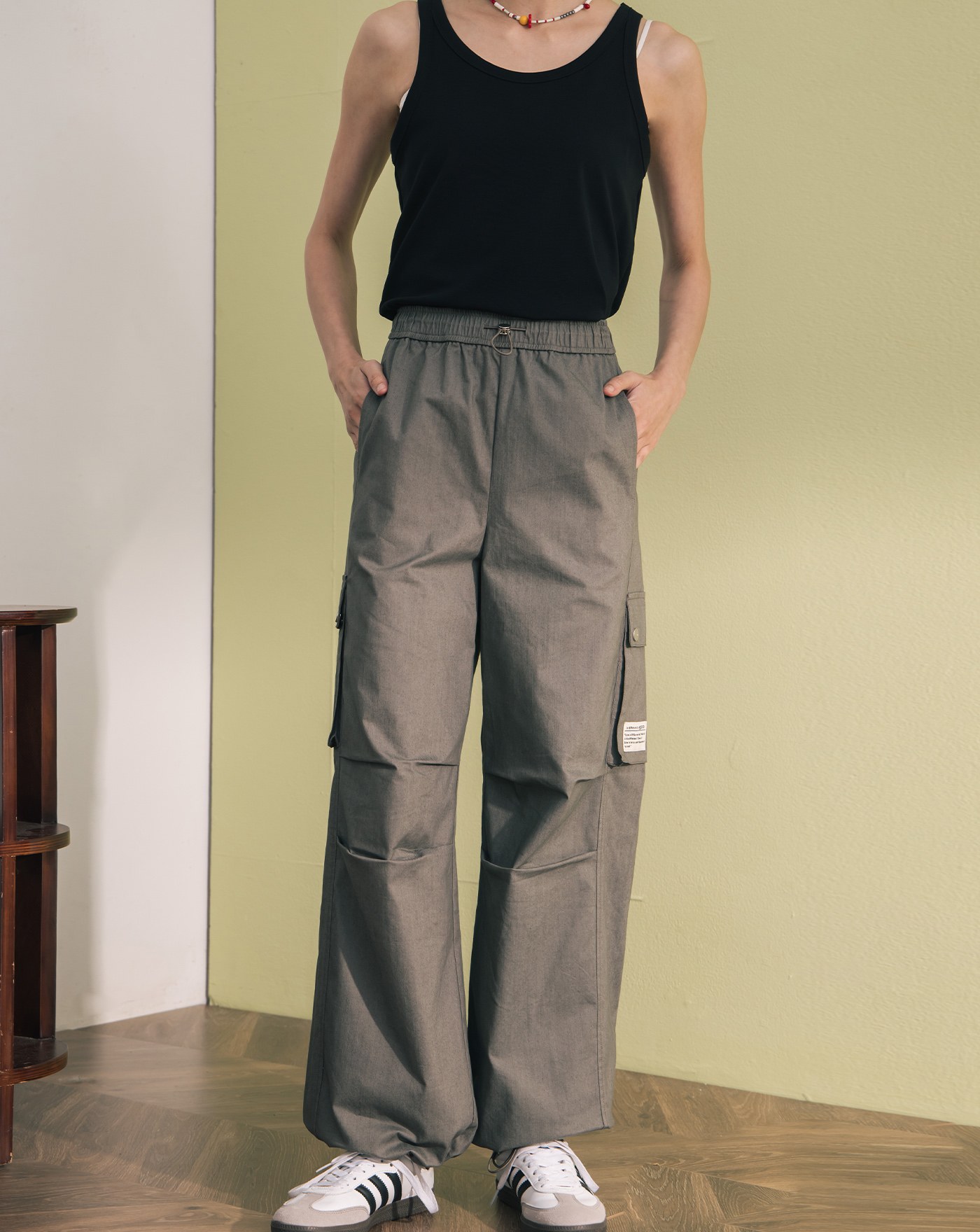 不對稱口袋顯瘦剪接廓型褲(附造型絲巾)(兩色)
