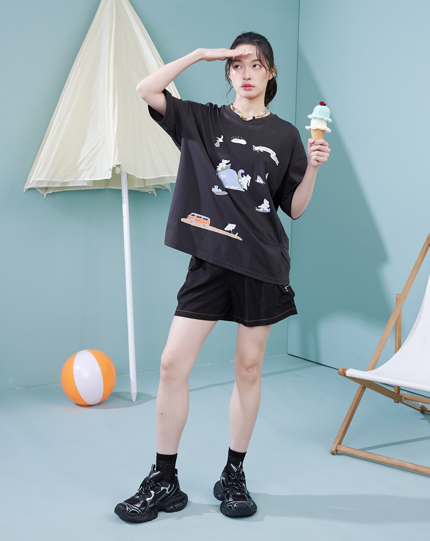 ➤海邊風景抓褶擴型涼感T恤(兩色)