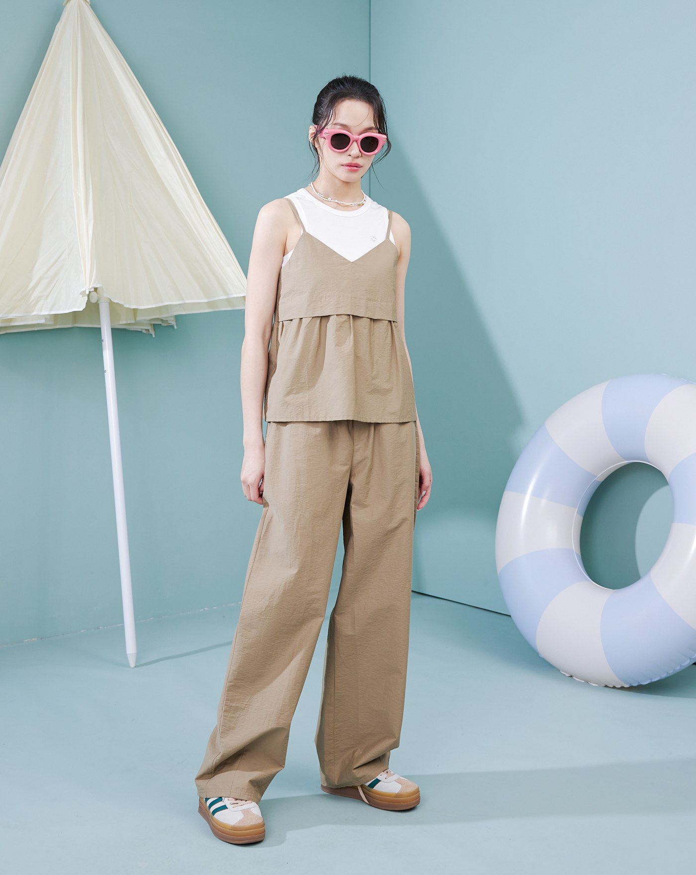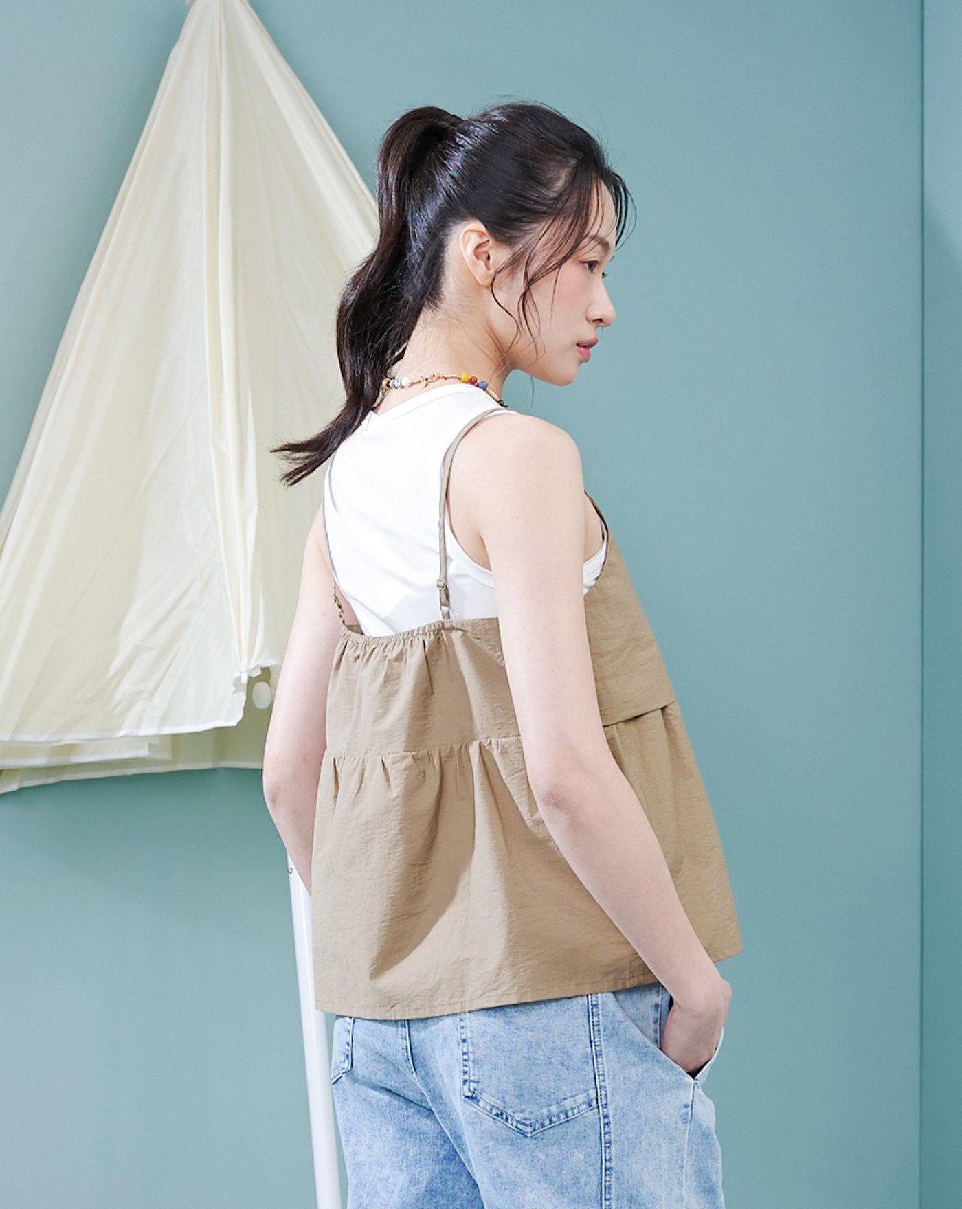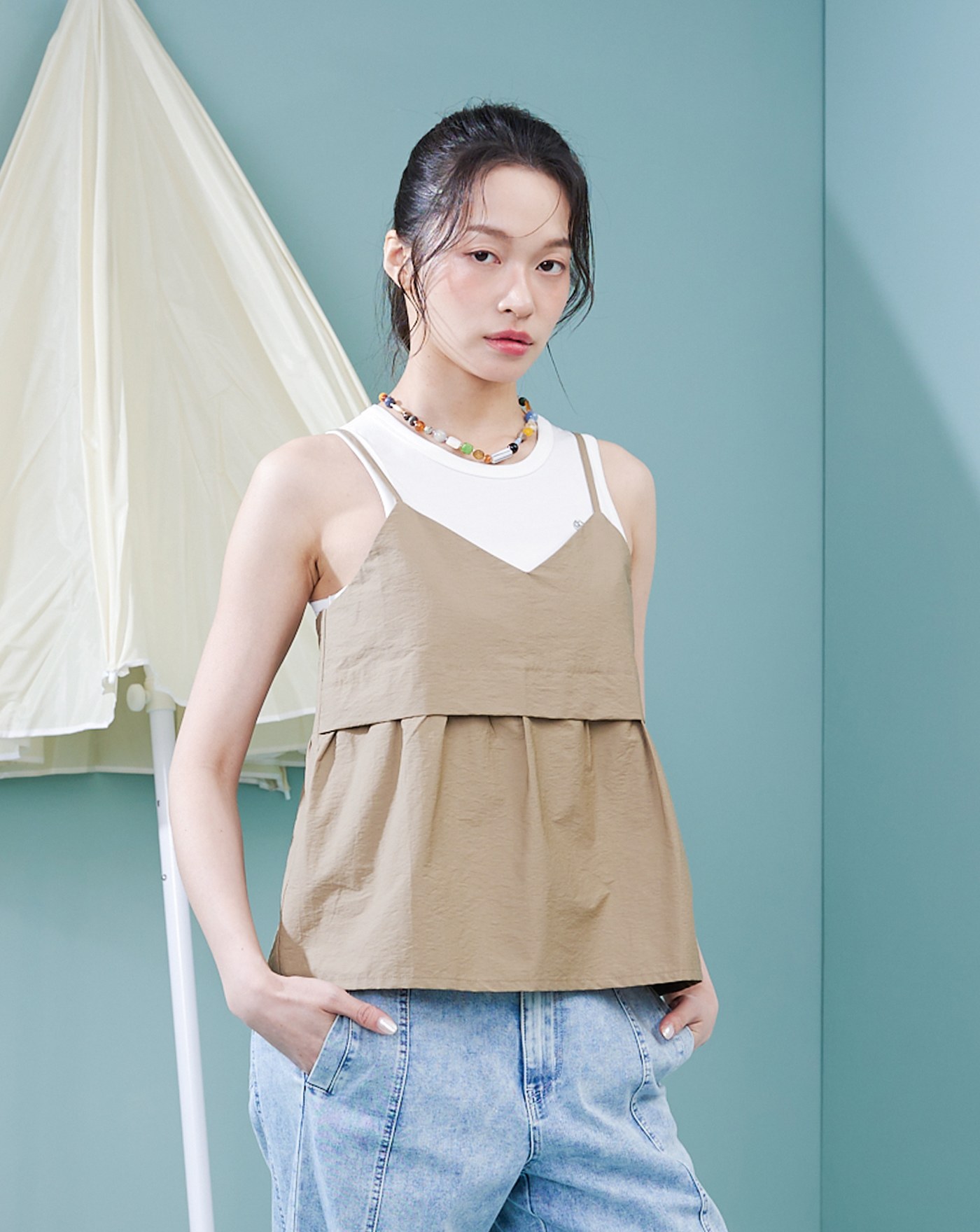 緹花荷葉吊帶背心兩件式字母T恤(兩色)
