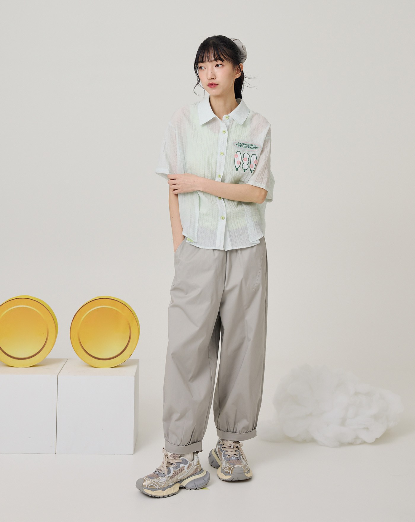 電影台詞刺繡天絲棉抓褶短袖襯衫(兩色)