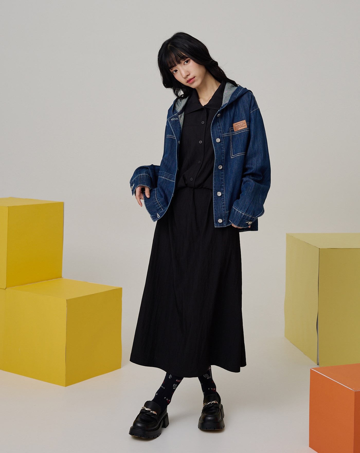 澎澎袖半開襟柔軟仿牛仔洋裝(兩色)
