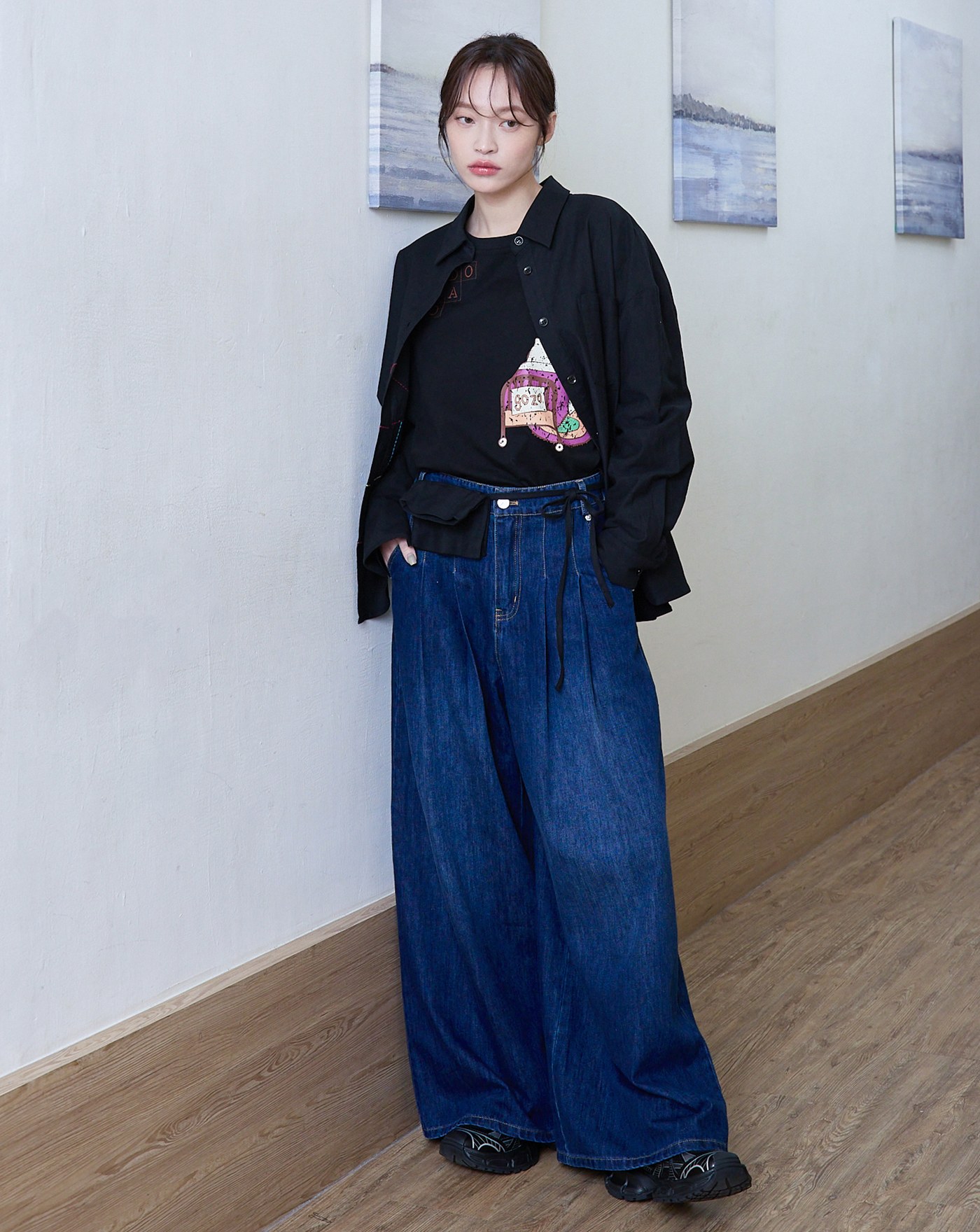 好比例鑰匙吊飾打褶牛仔大寬褲(兩色)