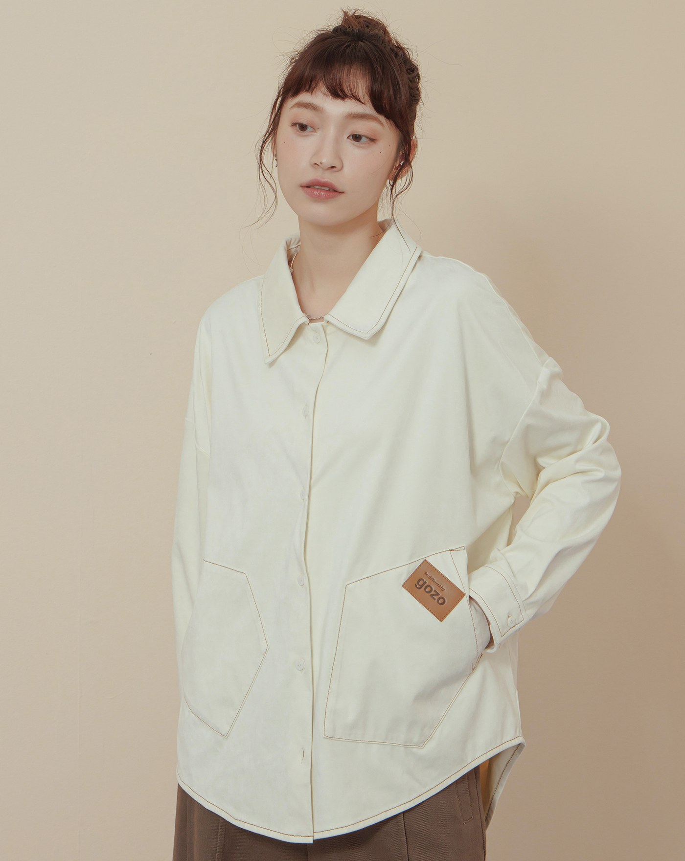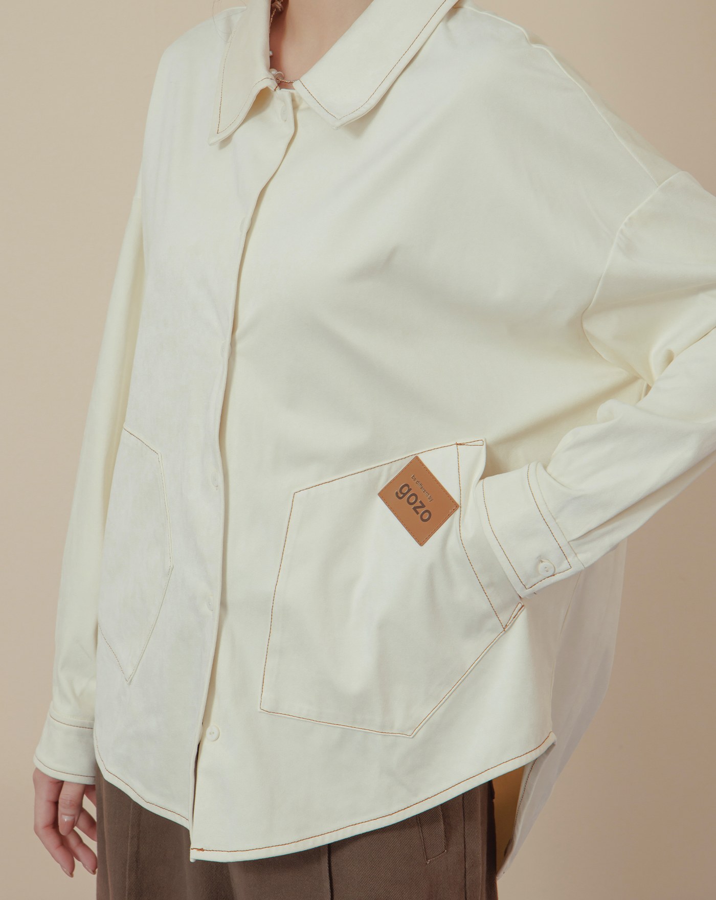 配色釦造型打褶下擺長袖襯衫(三色)
