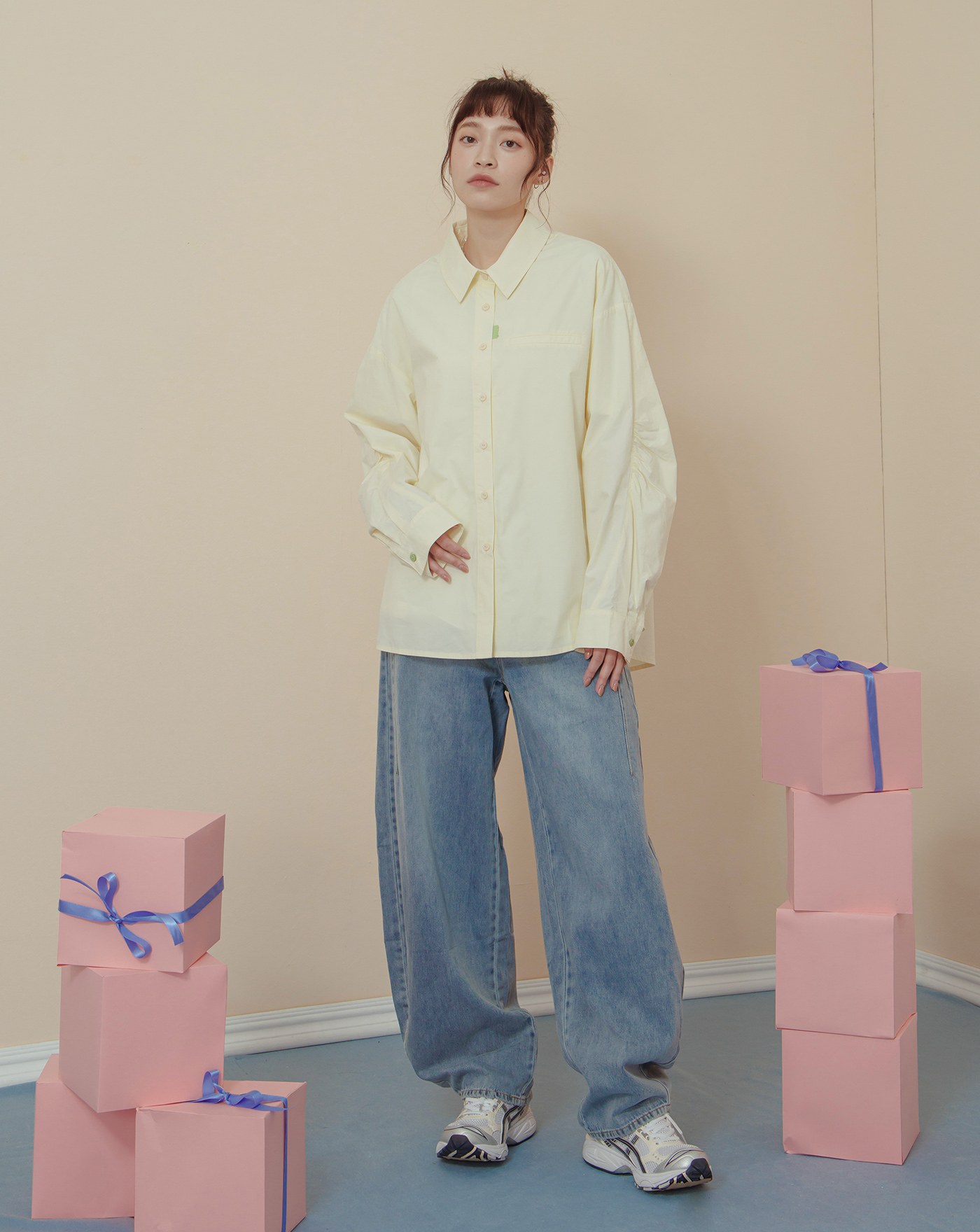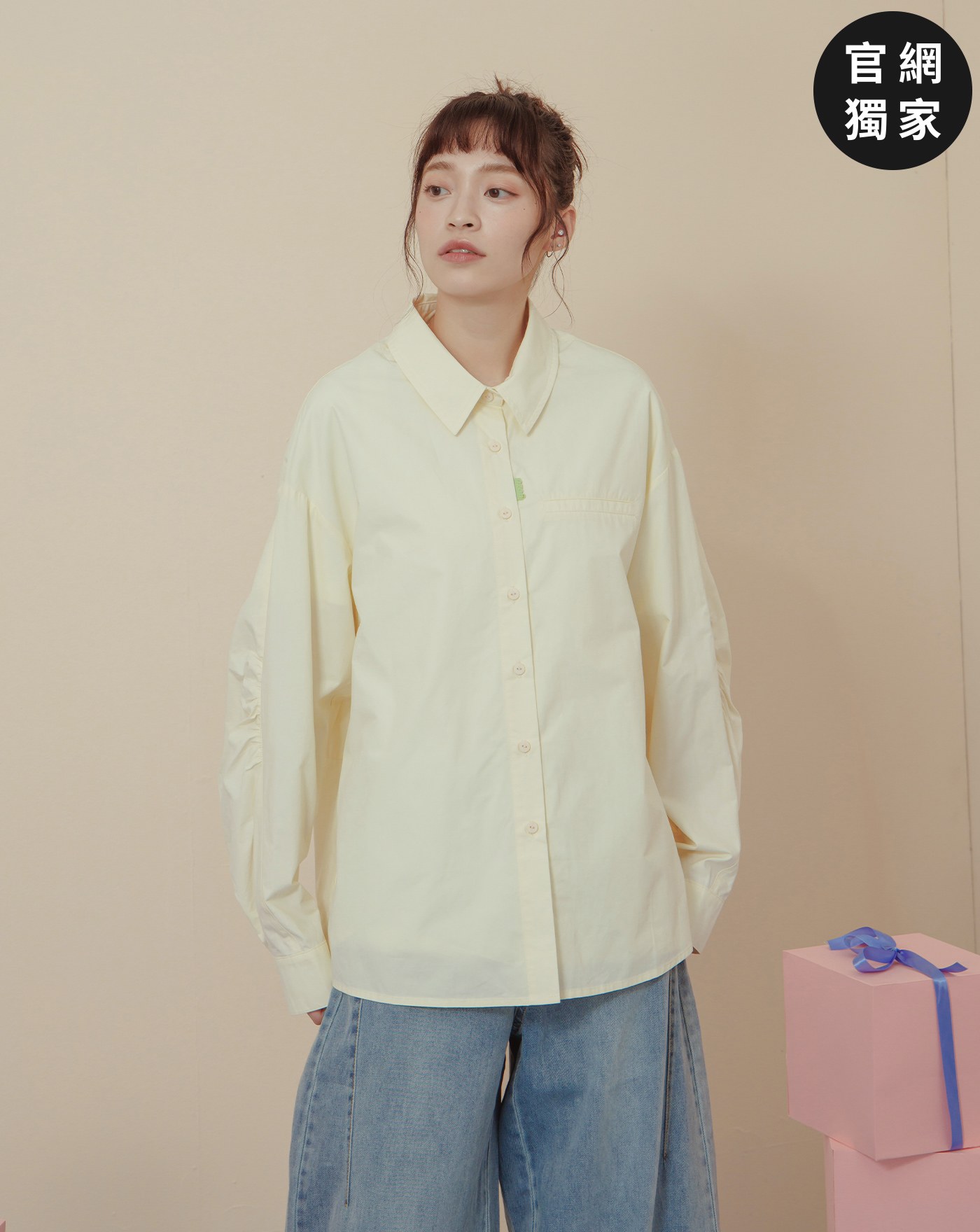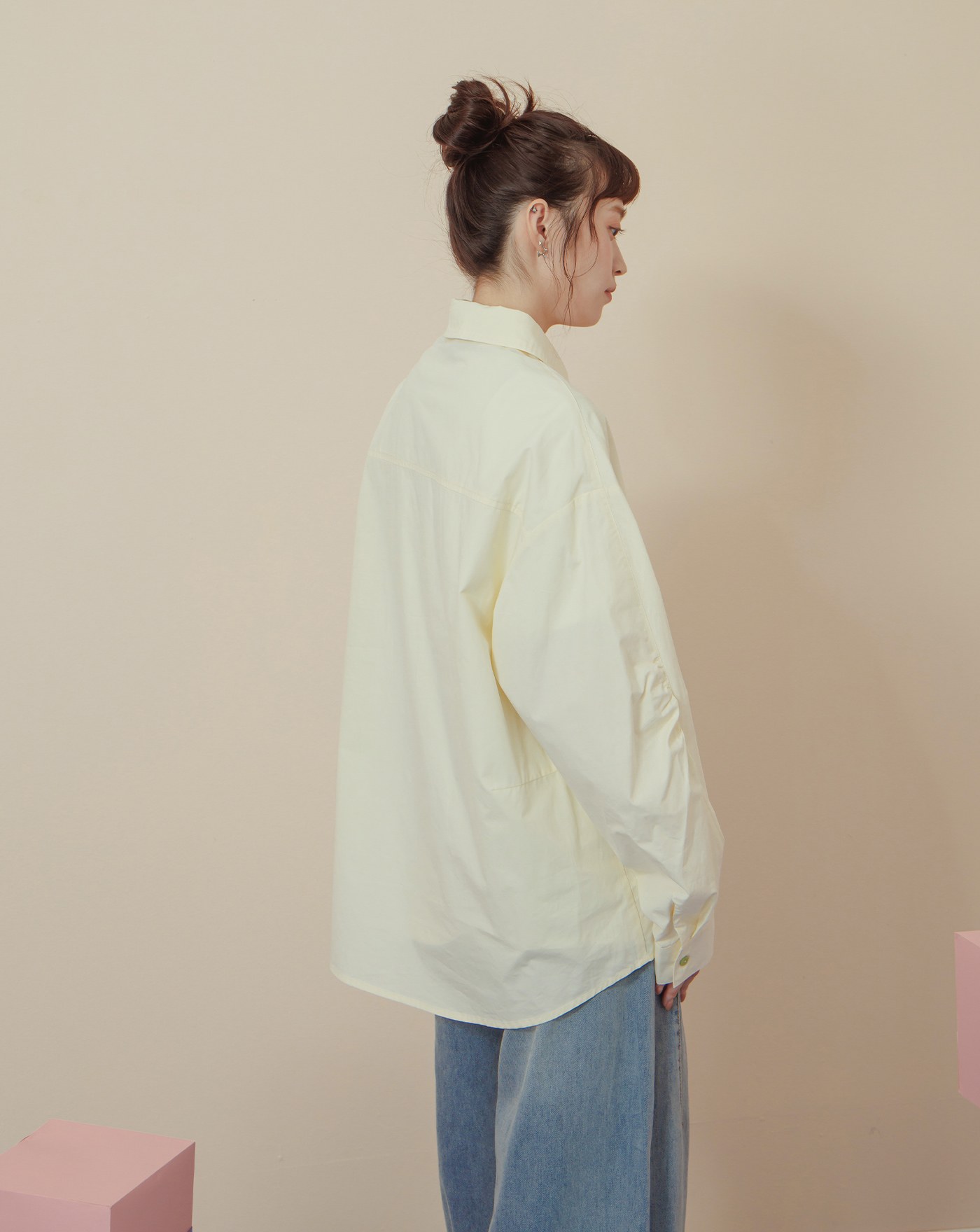 配色釦造型打褶下擺長袖襯衫(三色)