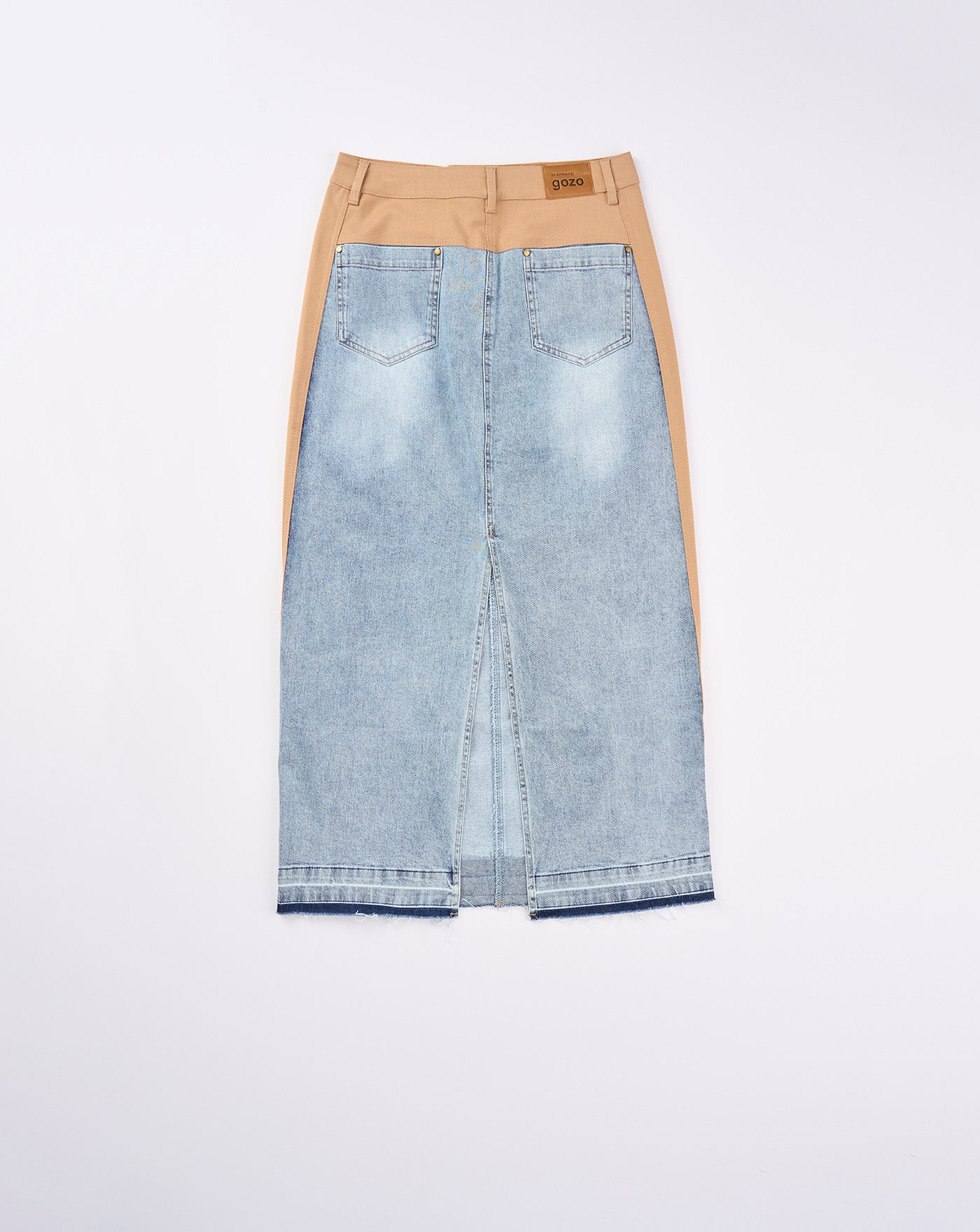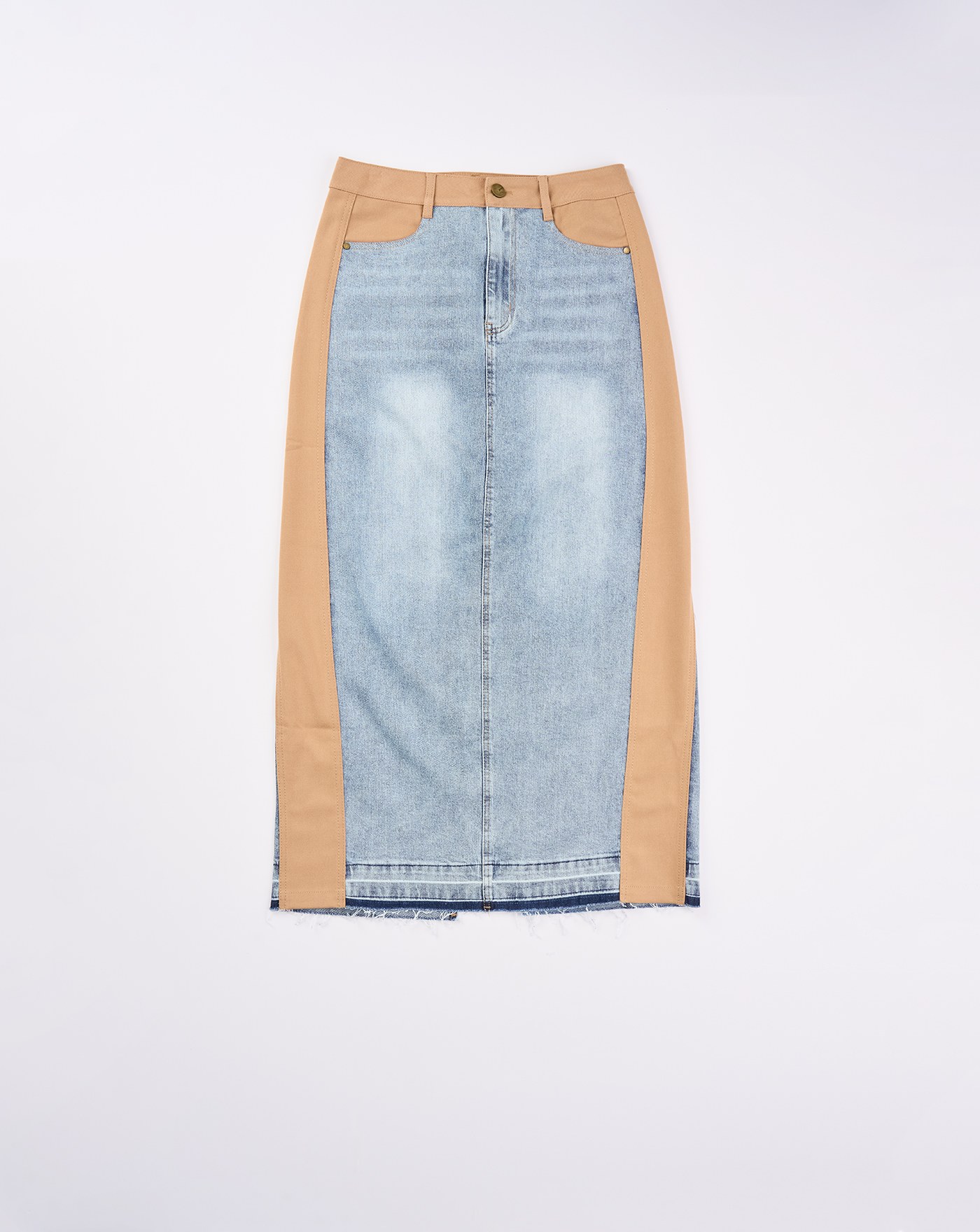 A|顯瘦異材質拼接水洗牛仔長裙(兩色)