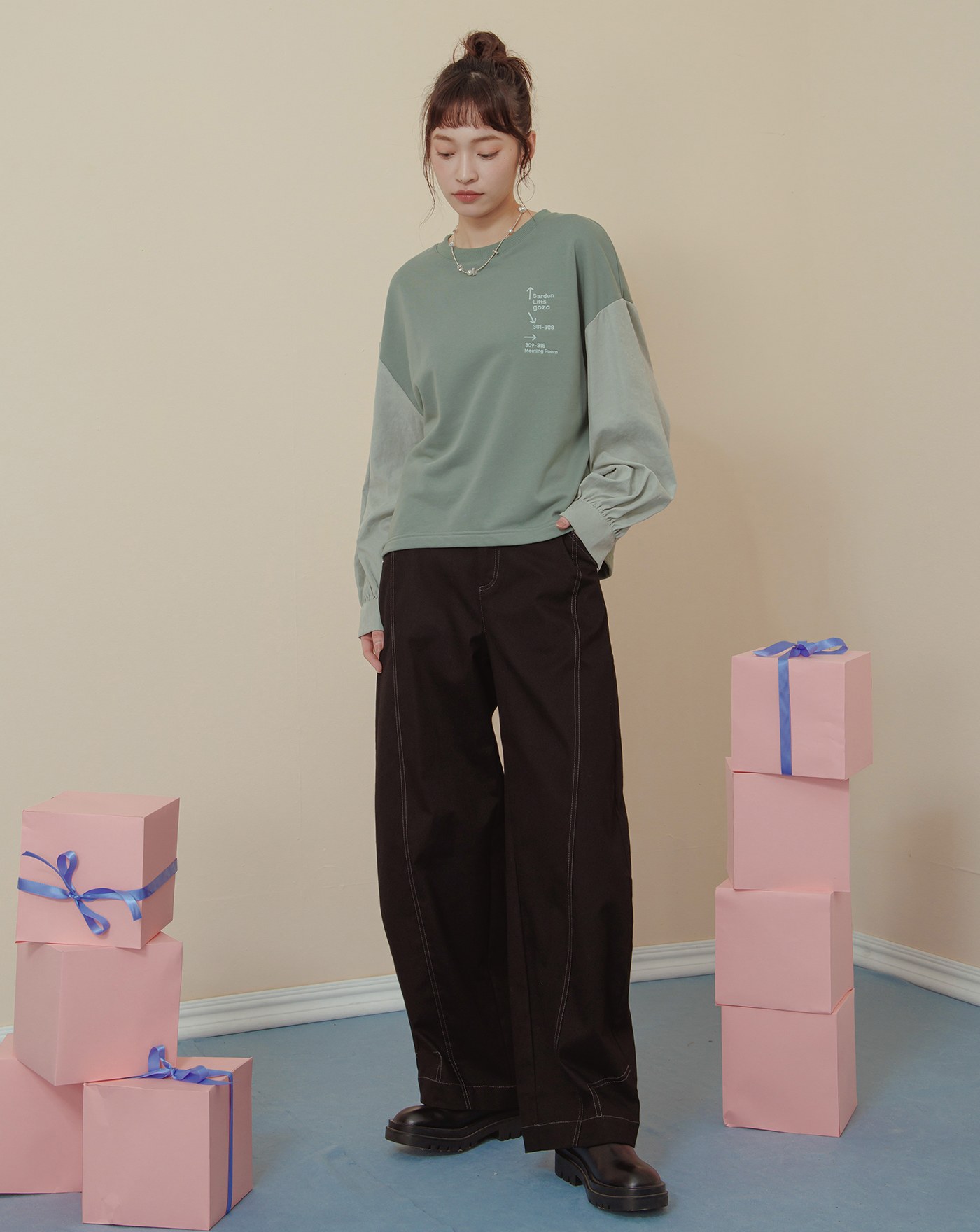 異材質拼接襯衫袖造型落肩上衣(兩色)
