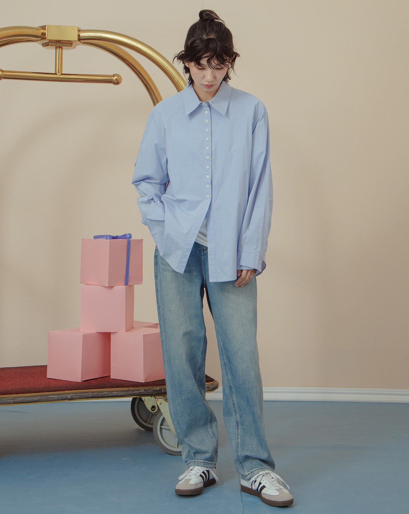 配色釦造型打褶下擺長袖襯衫(三色)