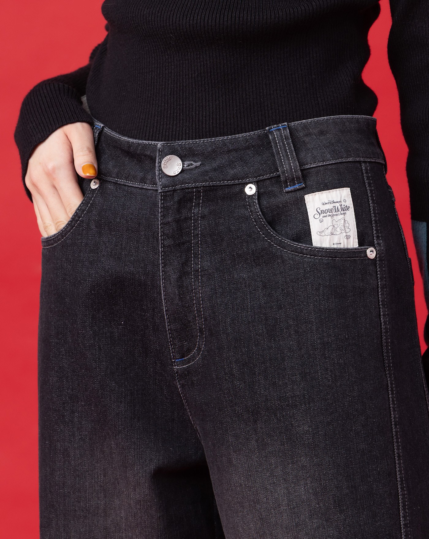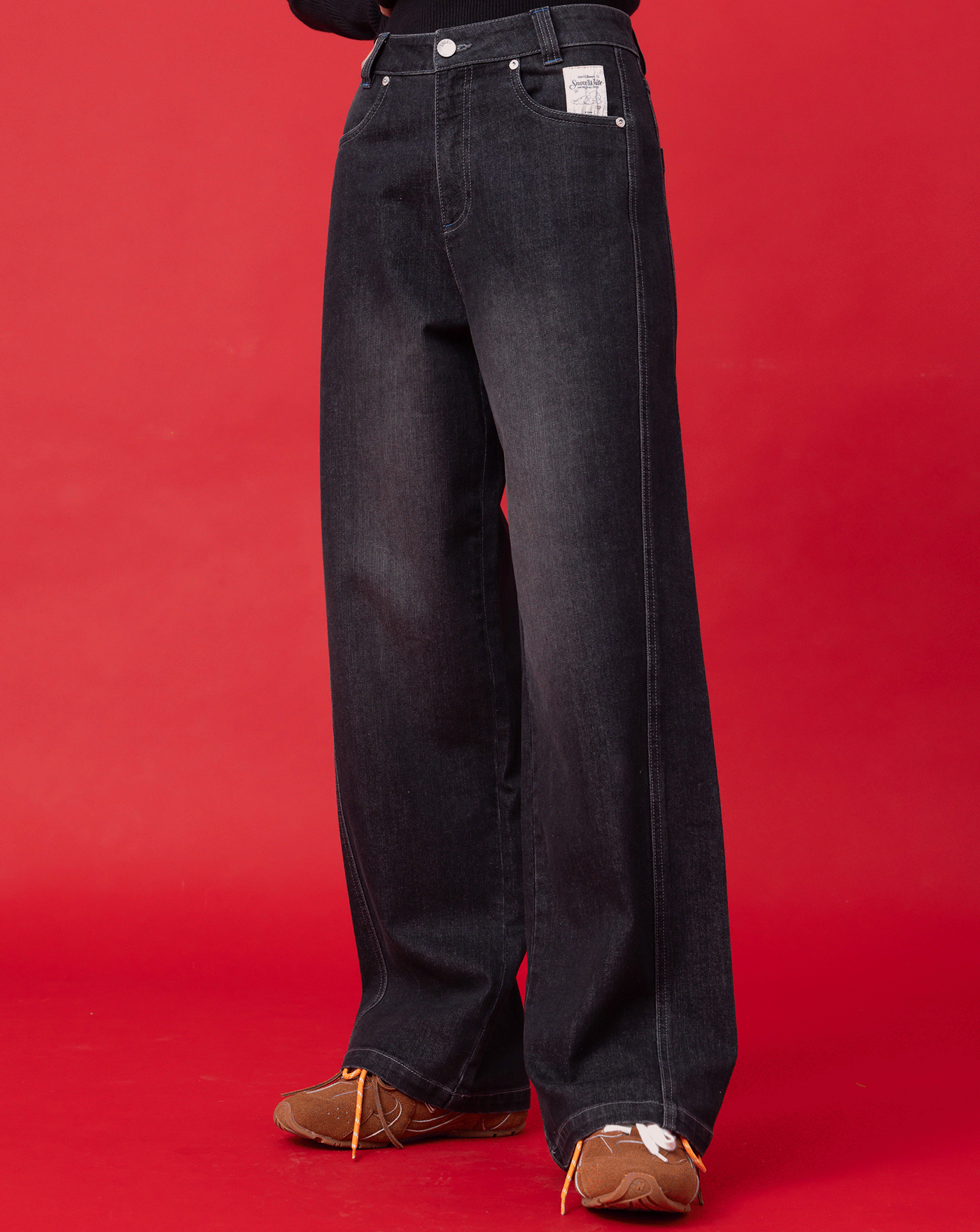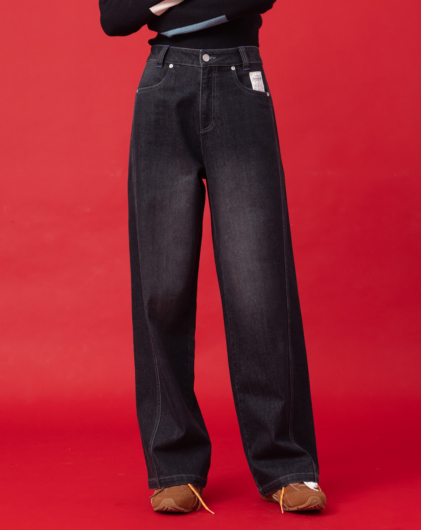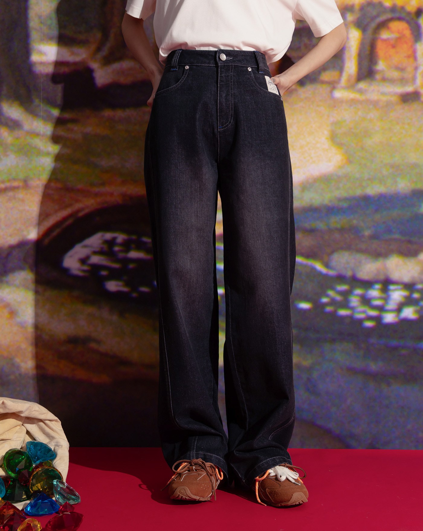 A|異材質拼接立體打褶抽繩牛仔寬褲(兩色)