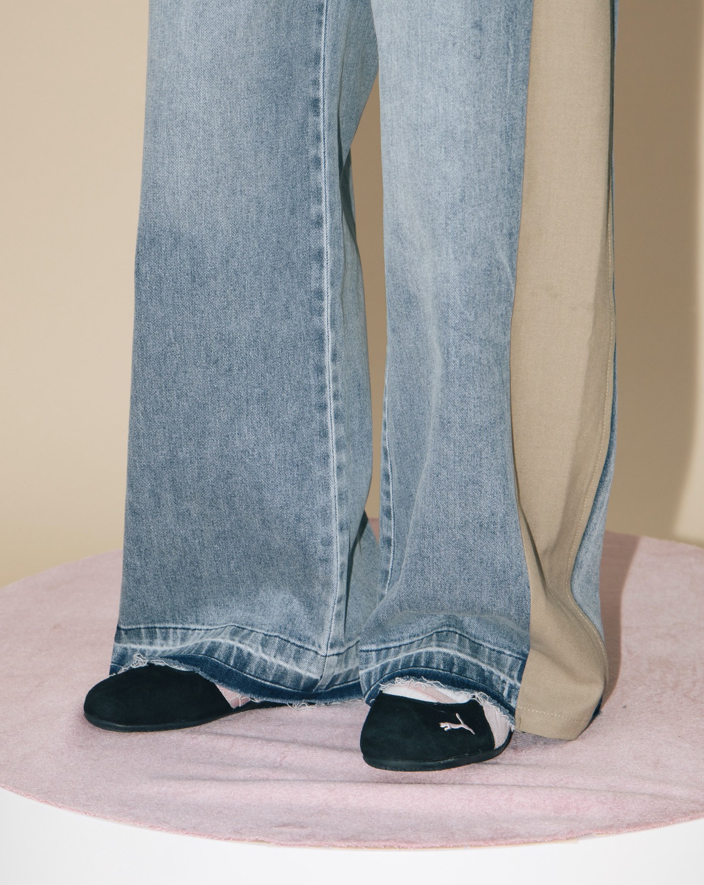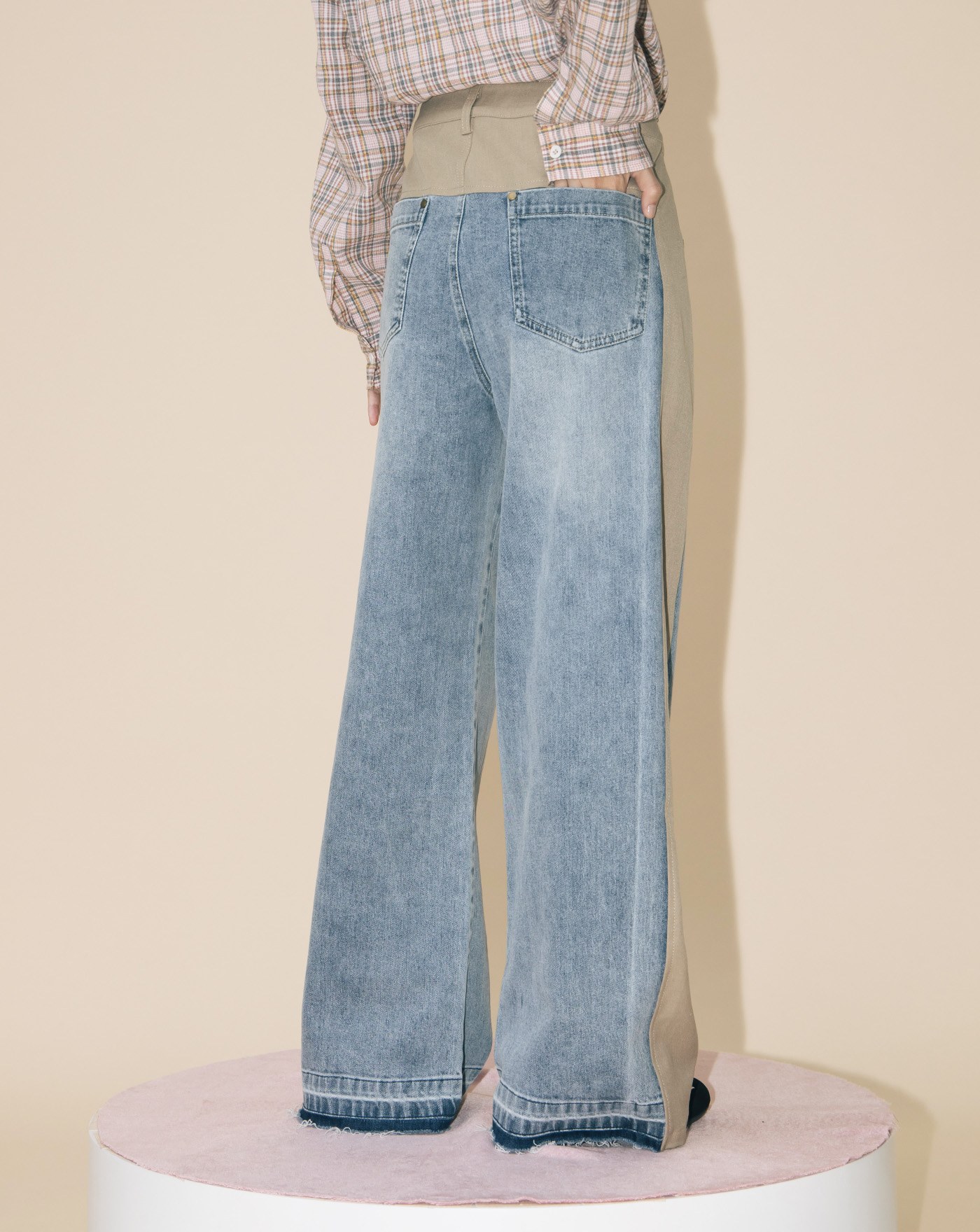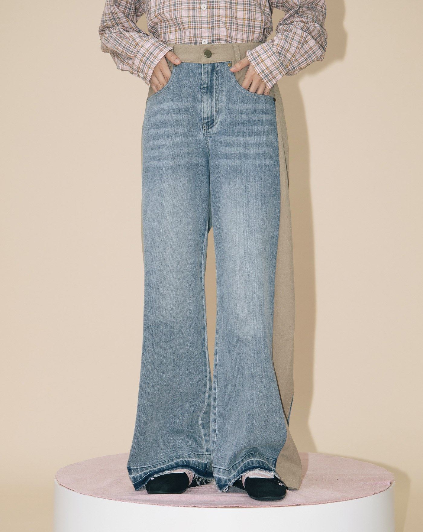 A|顯瘦異材質拼接水洗牛仔長裙(兩色)