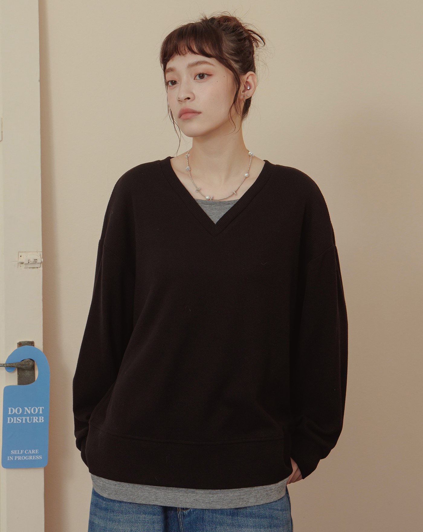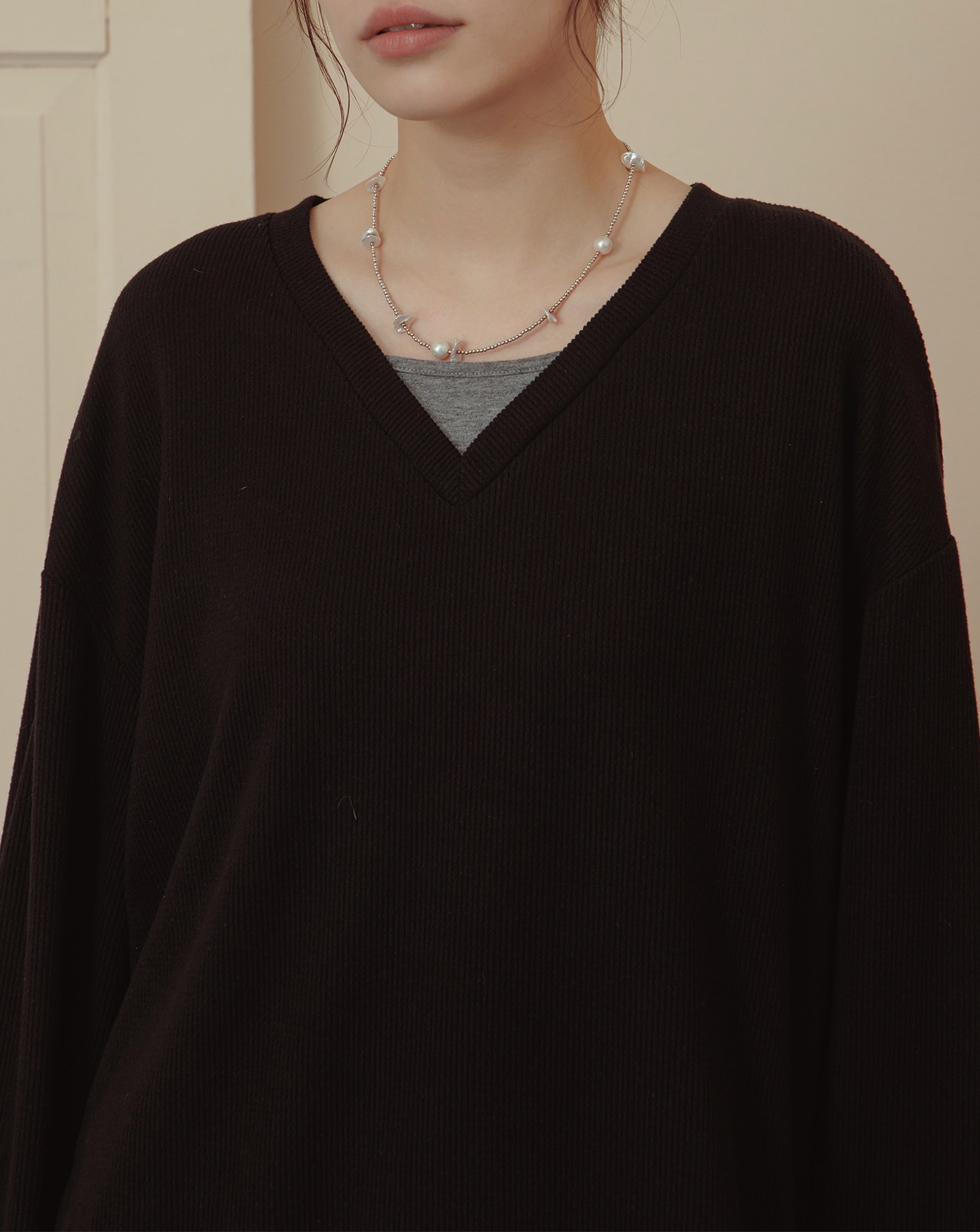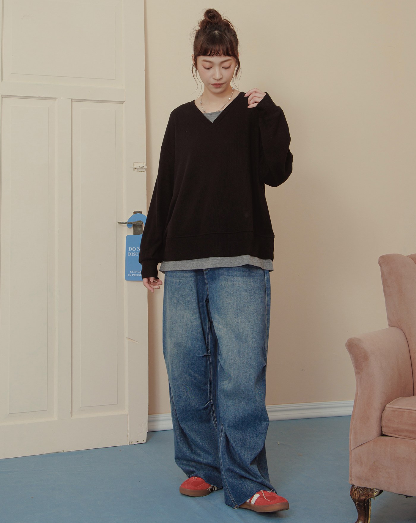 異材質拼接襯衫袖造型落肩上衣(兩色)