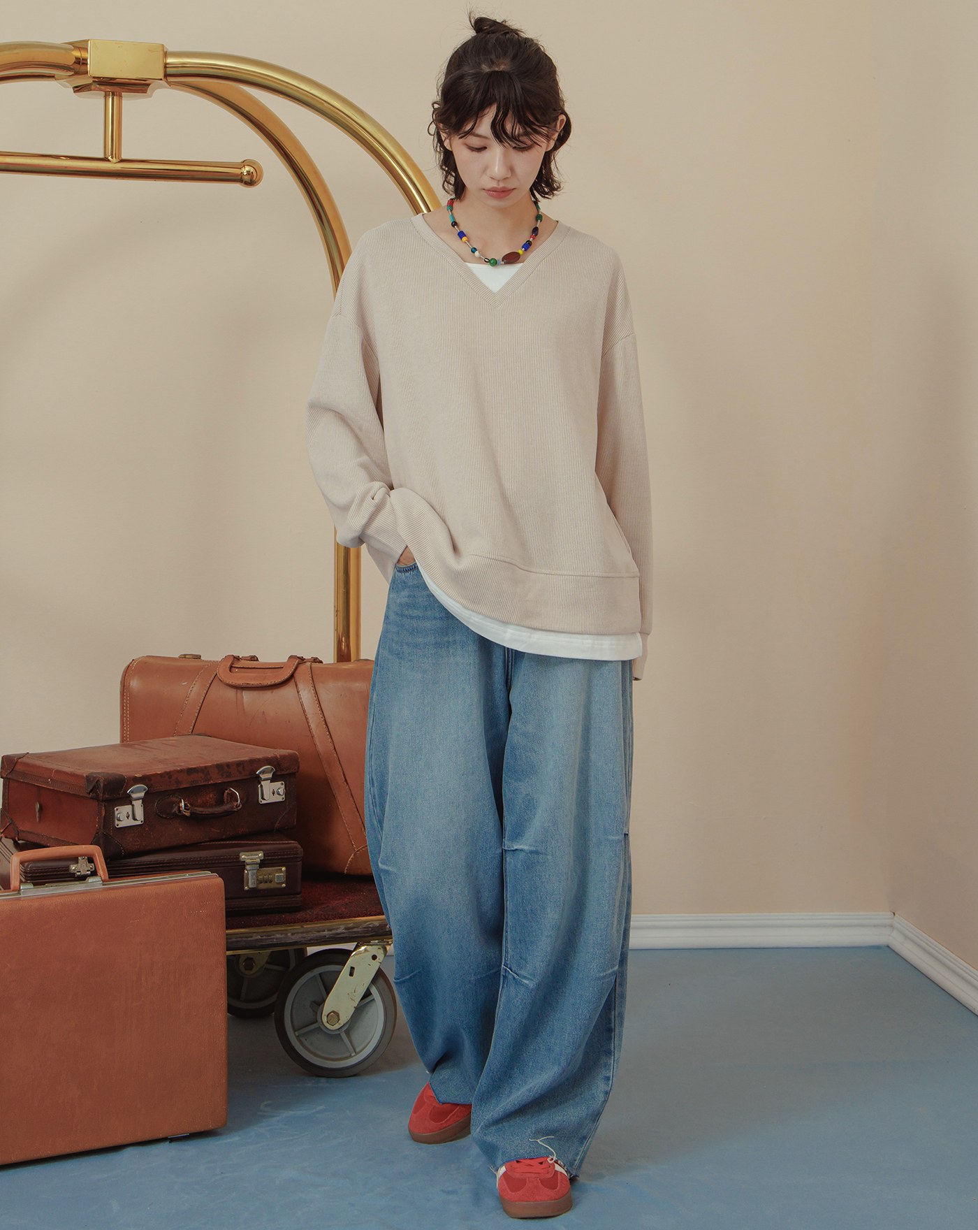率性抓褶不收邊下擺直筒牛仔褲(兩色)
