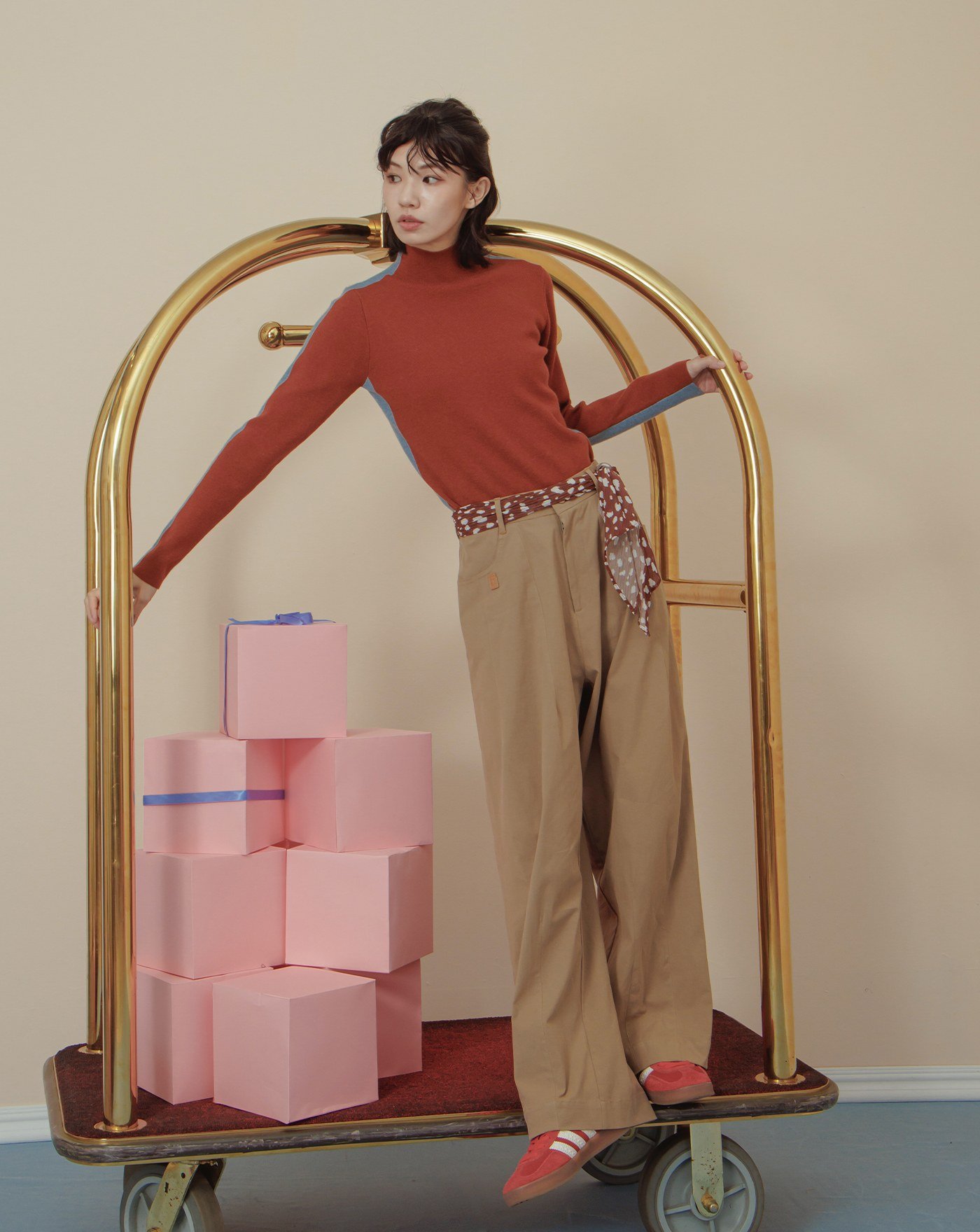 不對稱口袋顯瘦剪接廓型褲(附造型絲巾)(兩色)