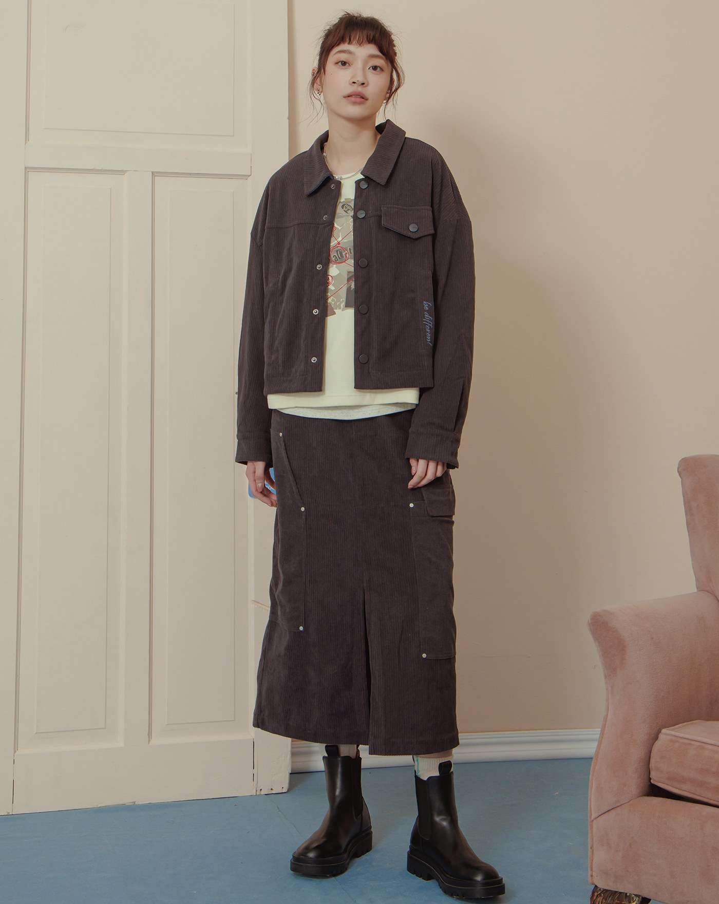 燈芯絨拼接造型口袋開衩長裙(兩色)