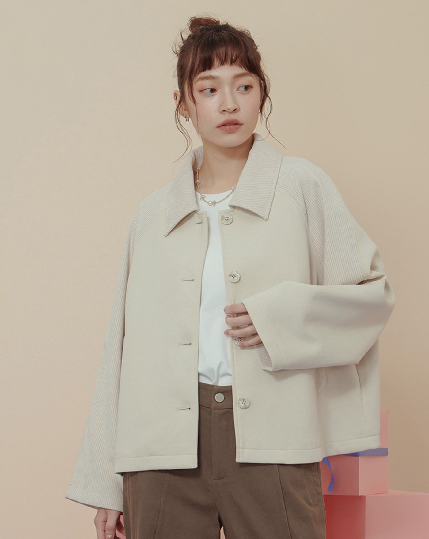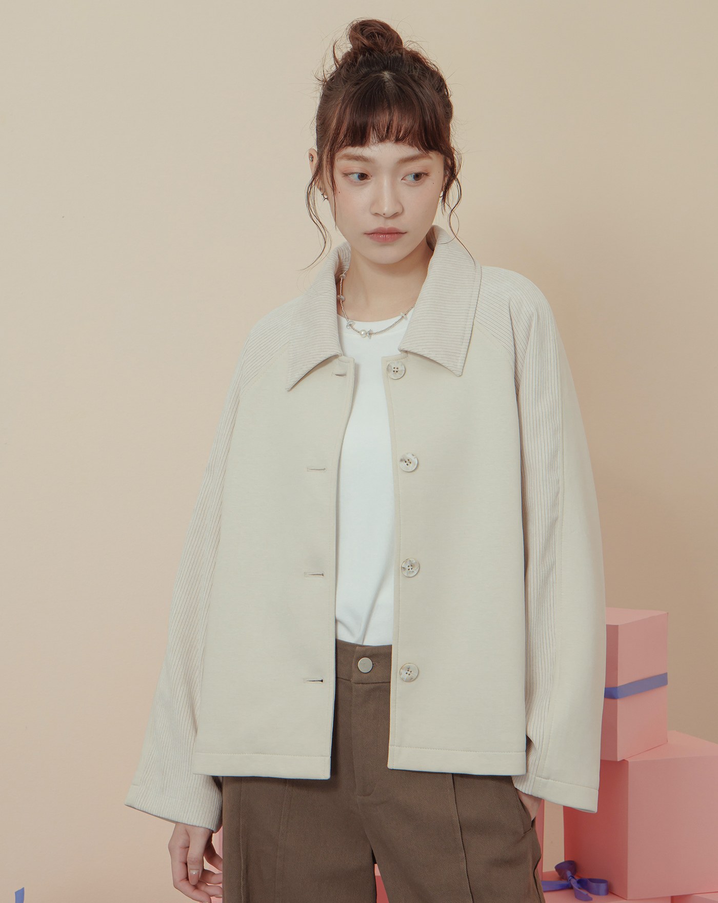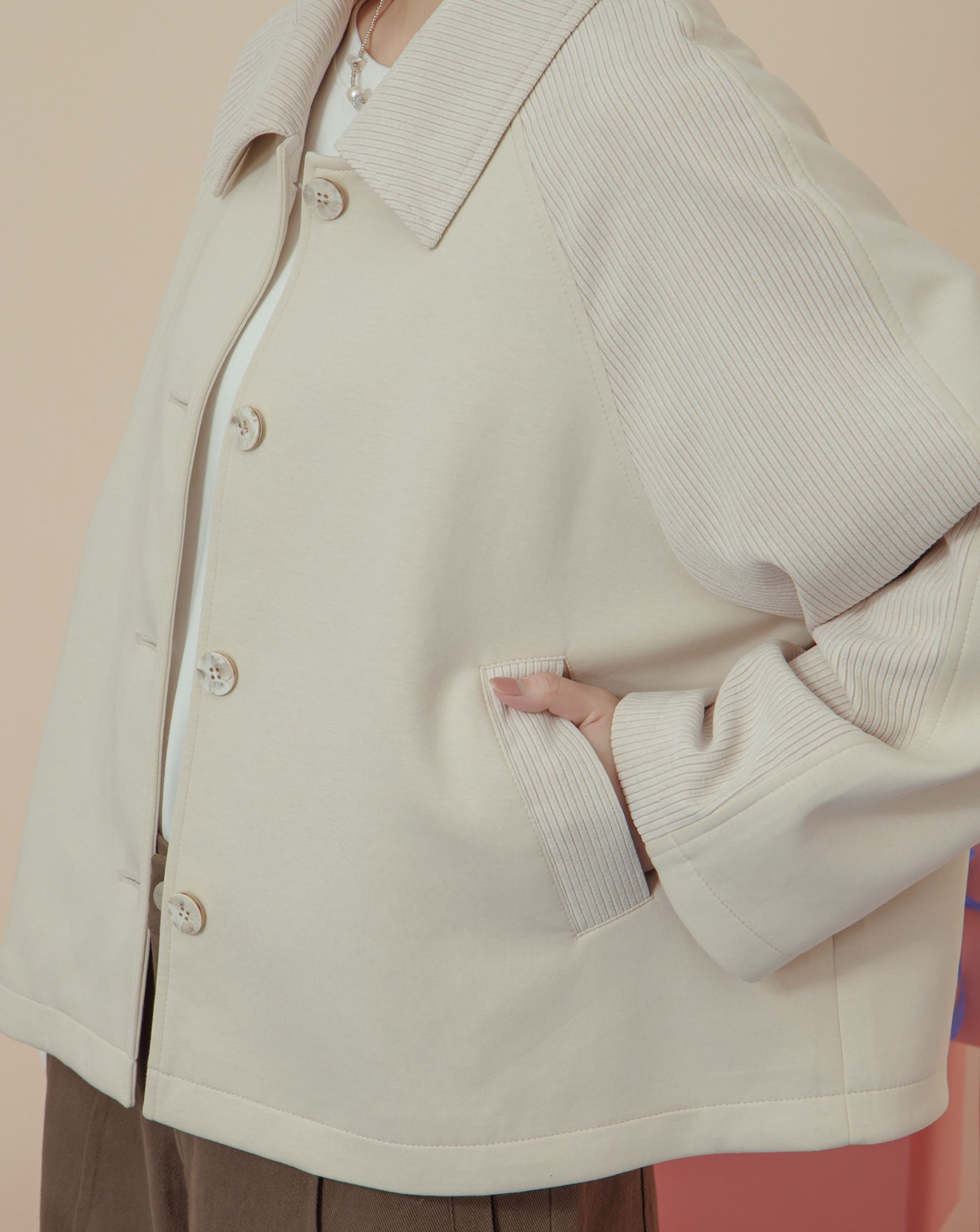 異材質配色拼接條絨襯衫外套(兩色)