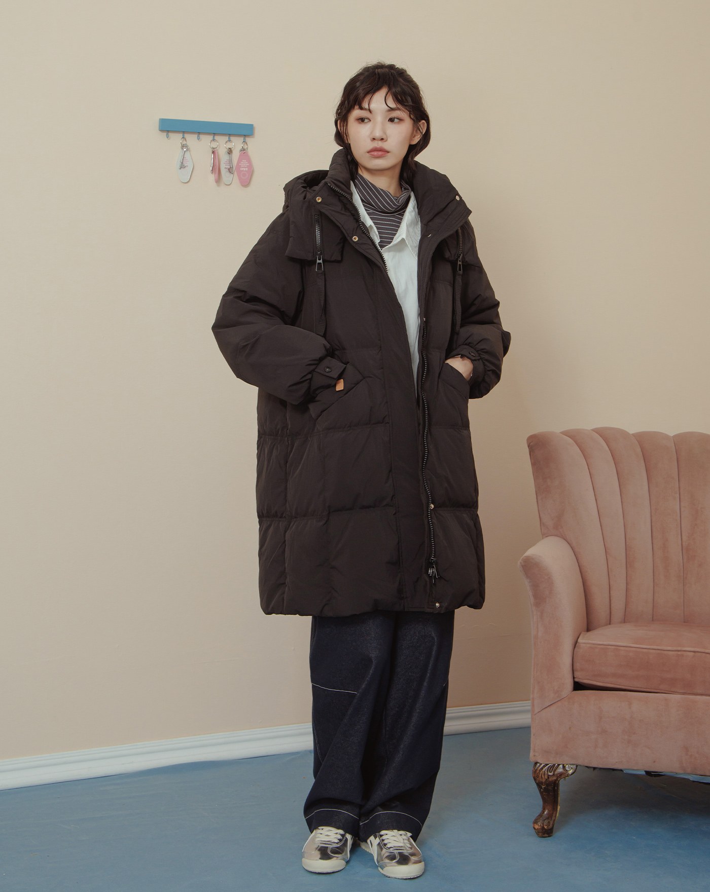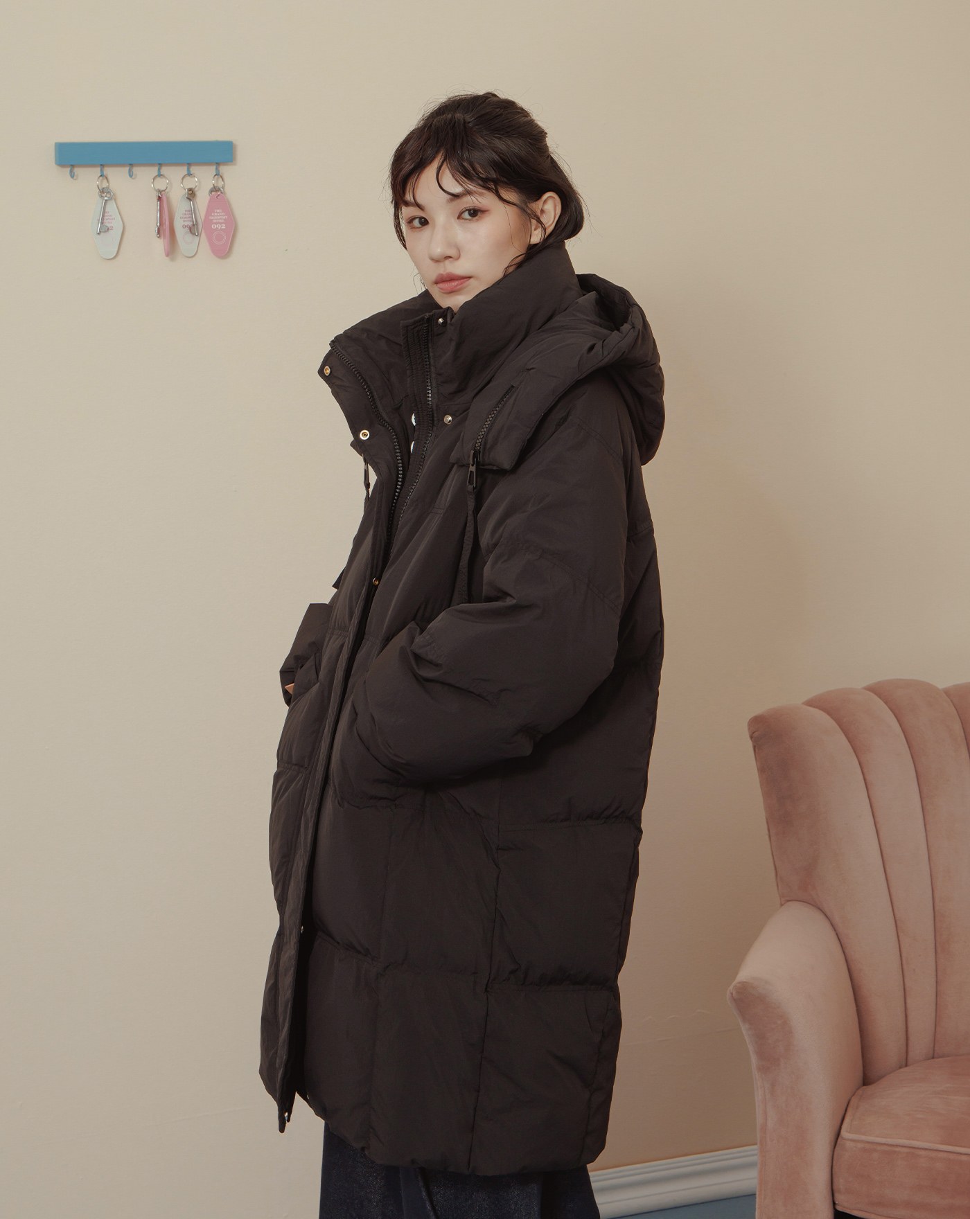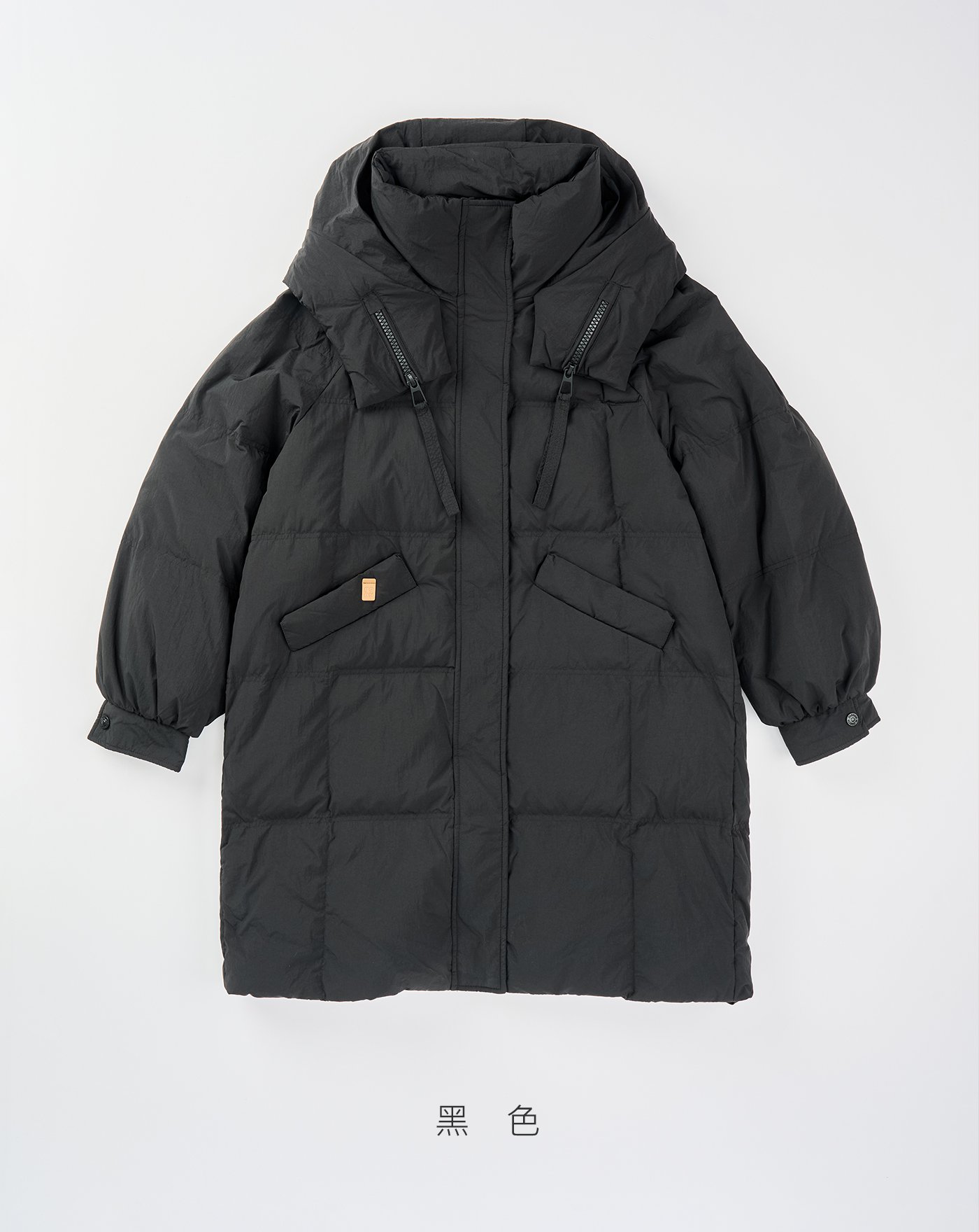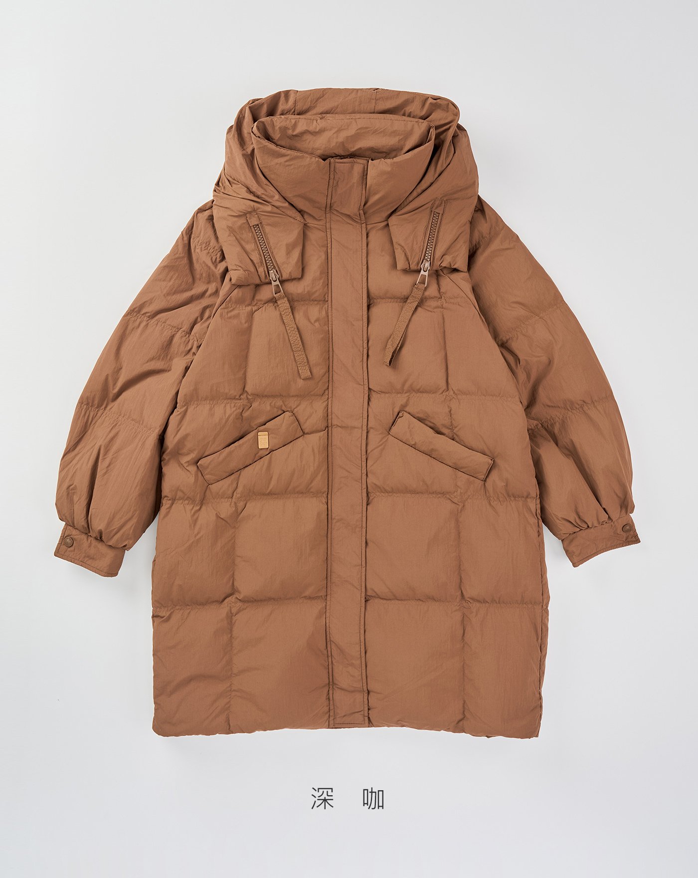 ➤造型口袋立領連帽長版羽絨外套(兩色)