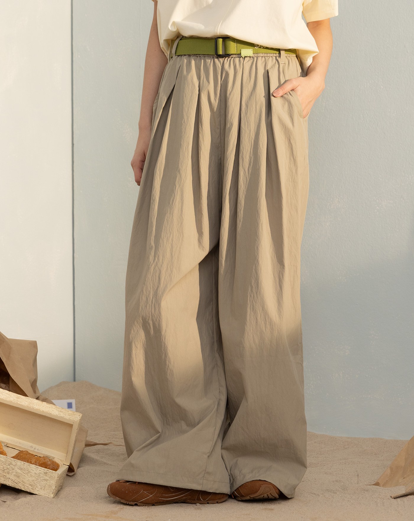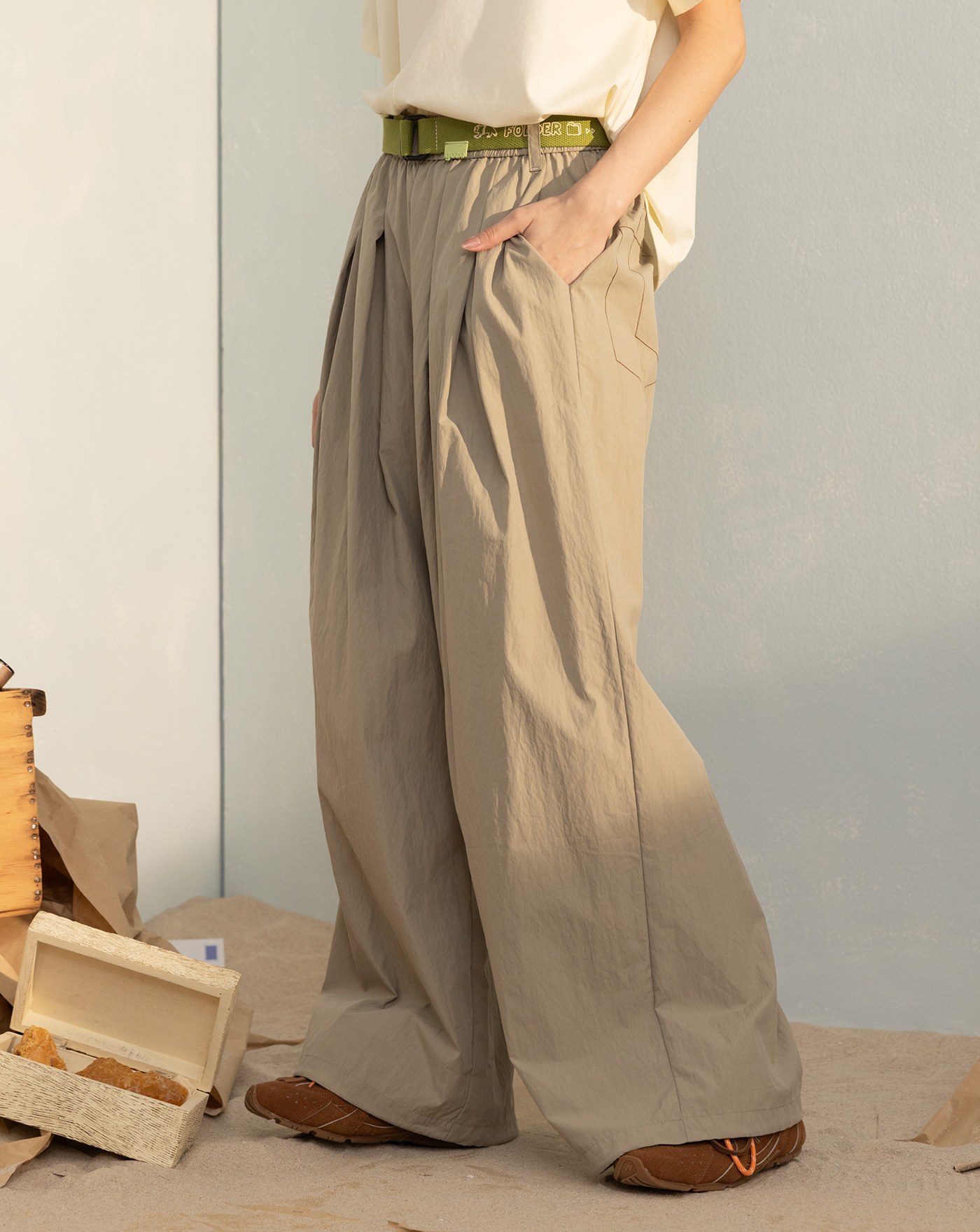 口袋框車線透氣鬆緊打褶寬褲(兩色)