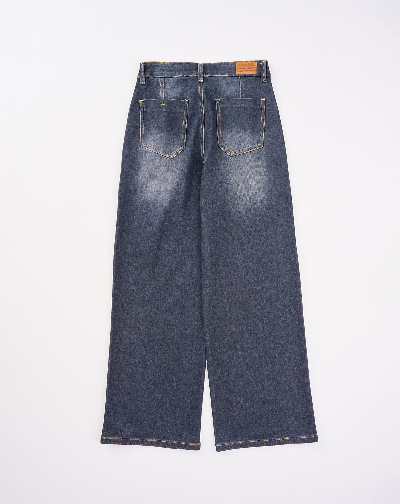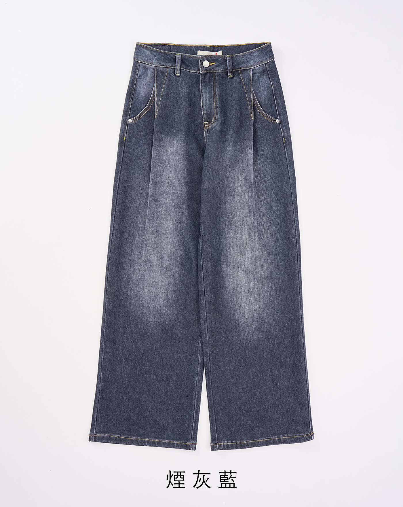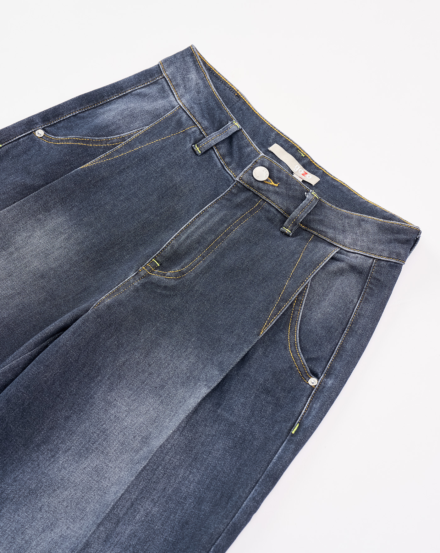 ◢3.0 零著感Q彈打褶牛仔寬褲(深藍)