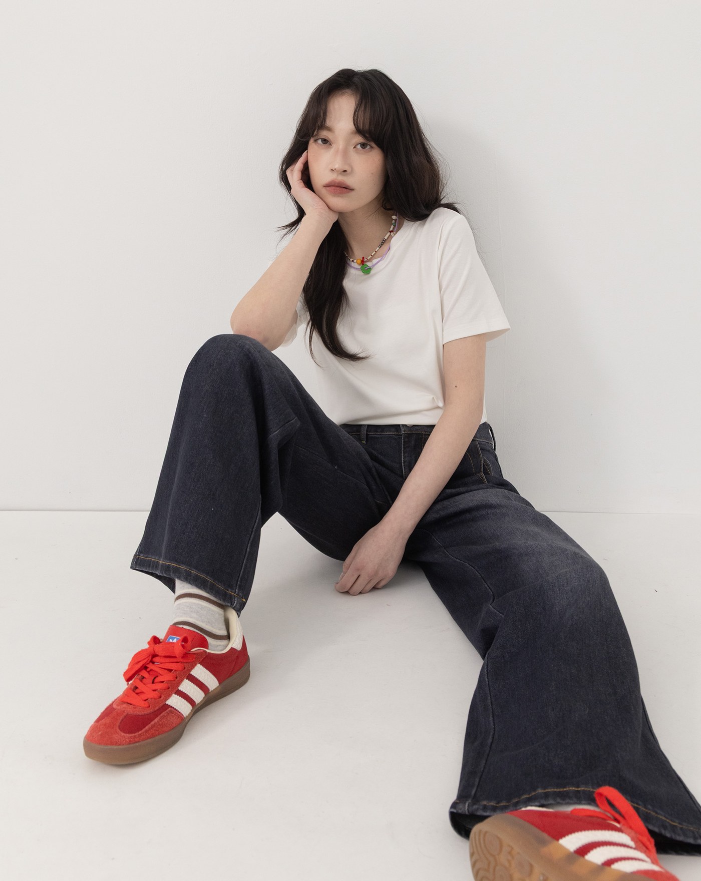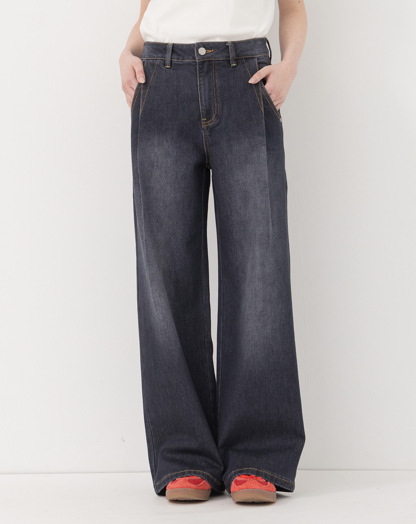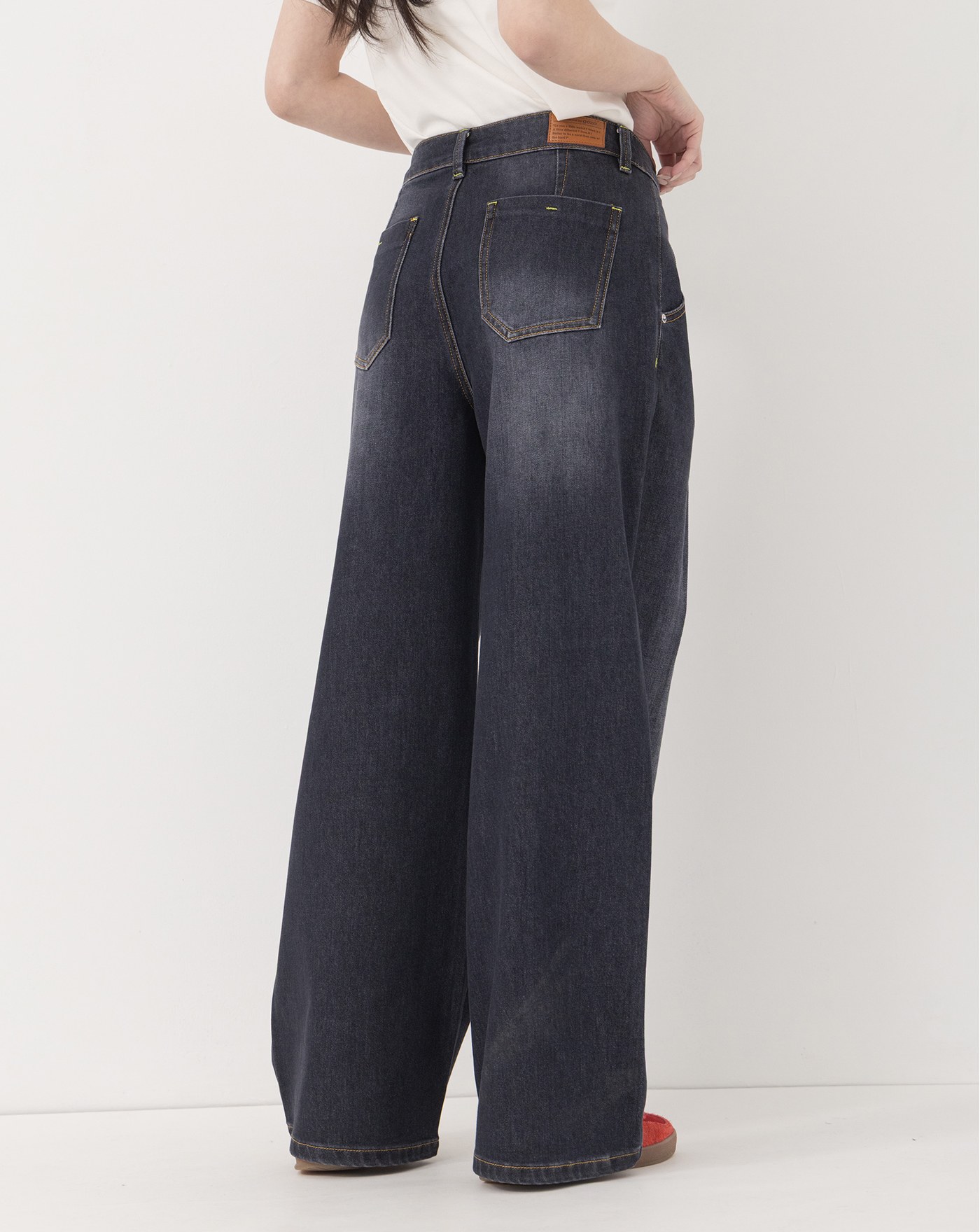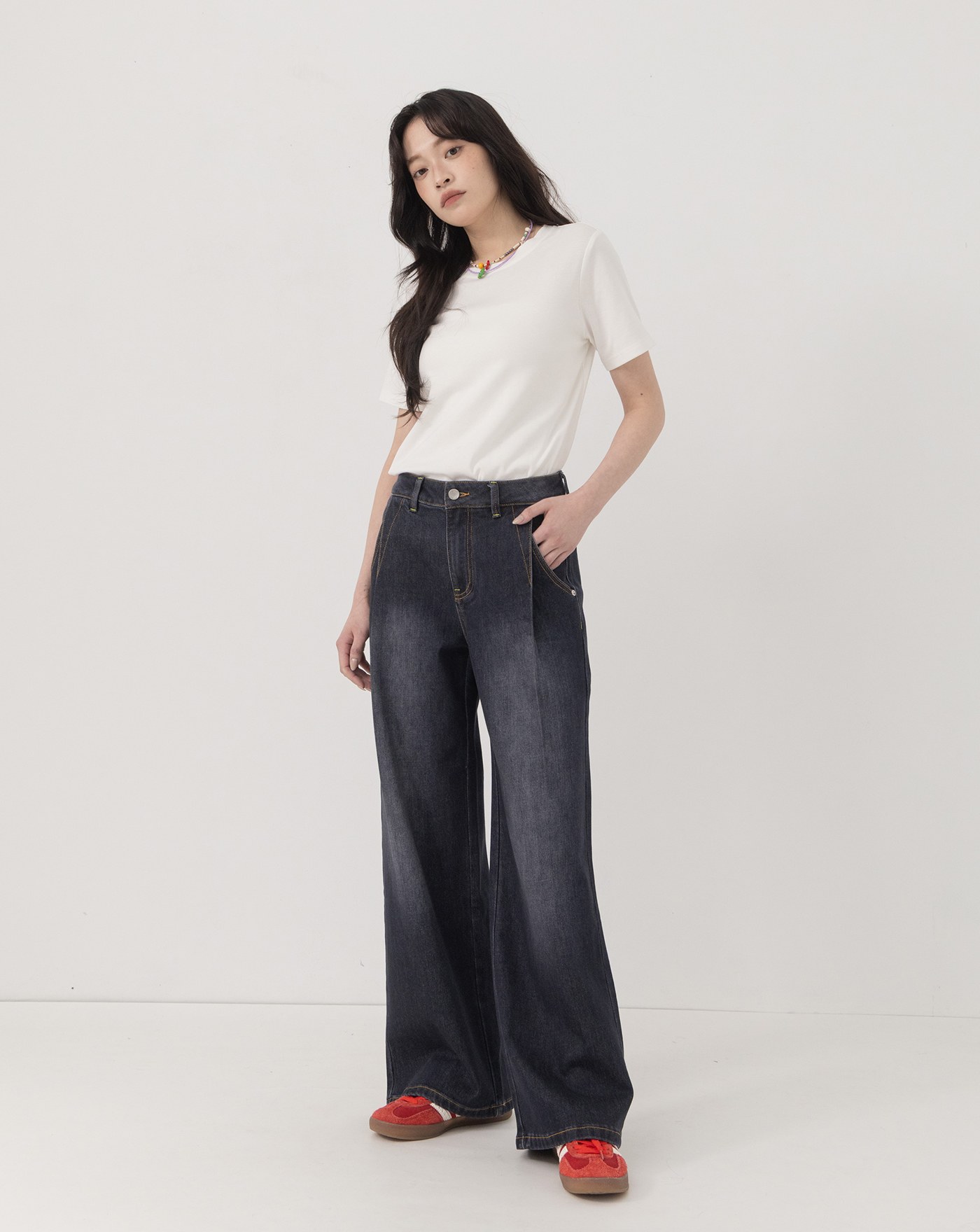 ◢3.0 零著感Q彈打褶牛仔寬褲(深藍)