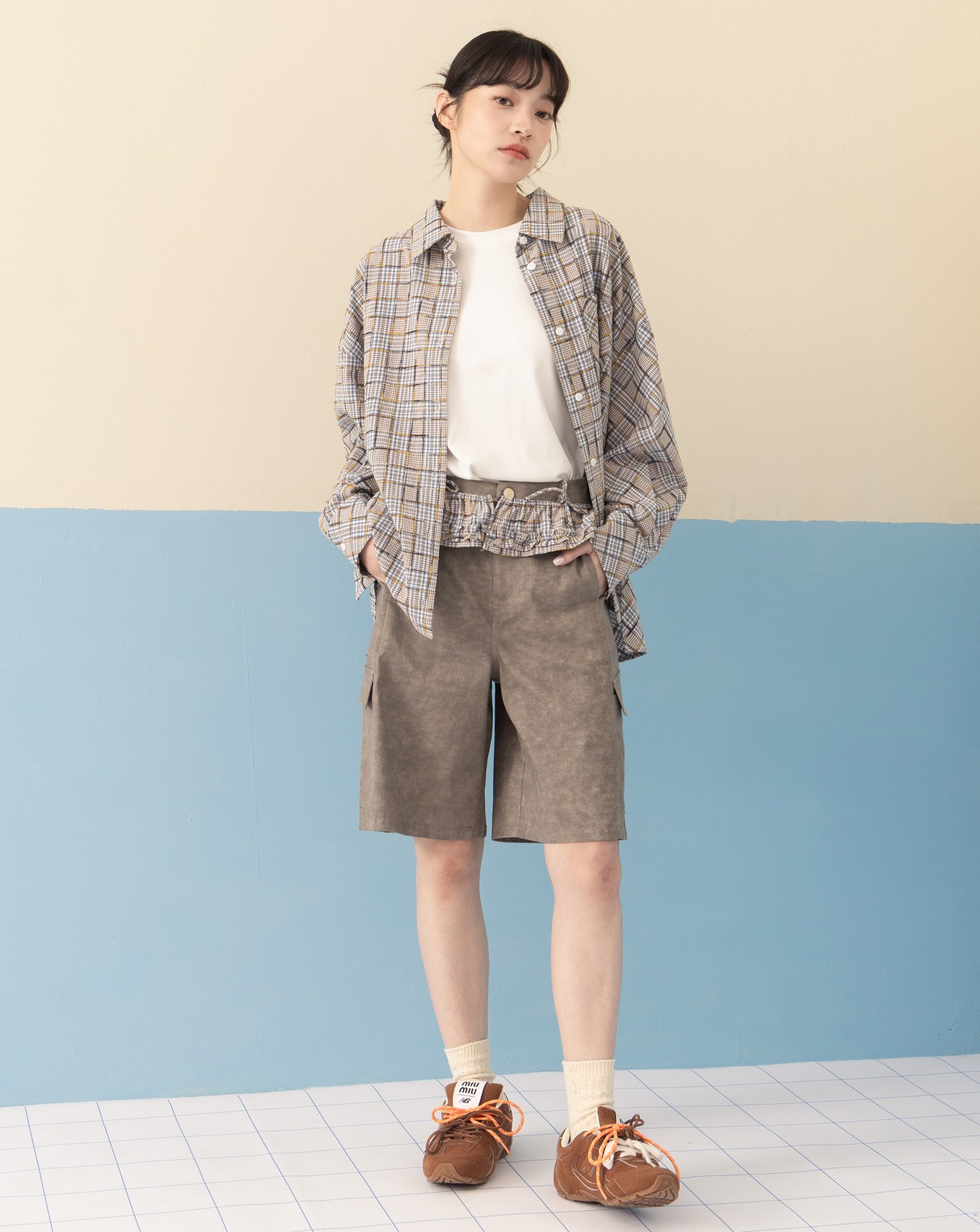 ◢g+微笑拼接格紋短褲(兩色)