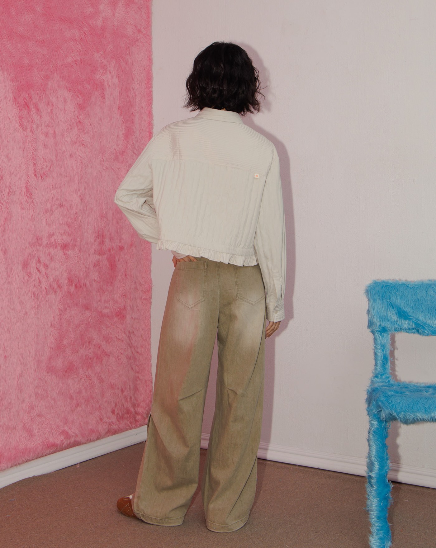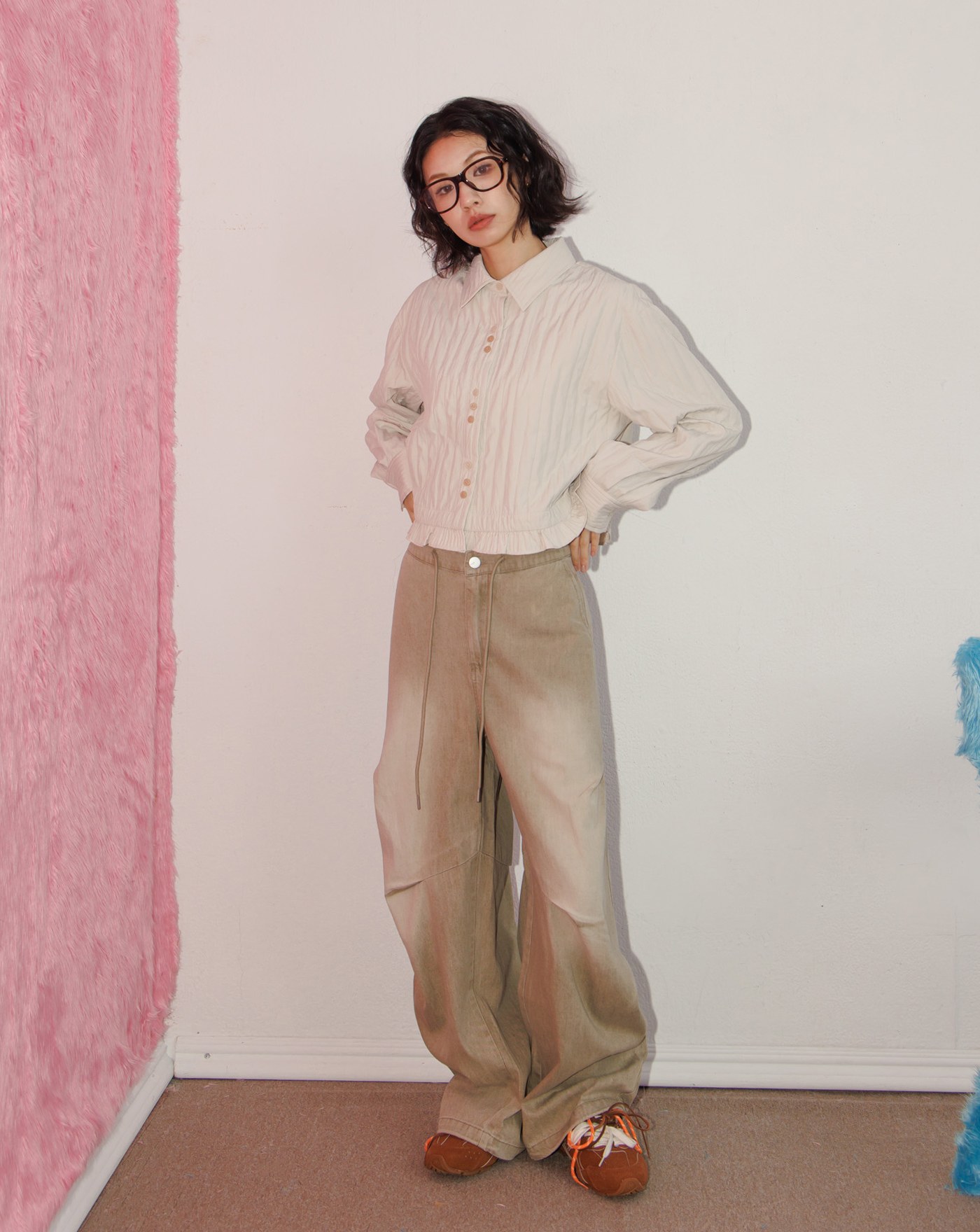 A|立體打褶低腰水洗牛仔寬褲(兩色)