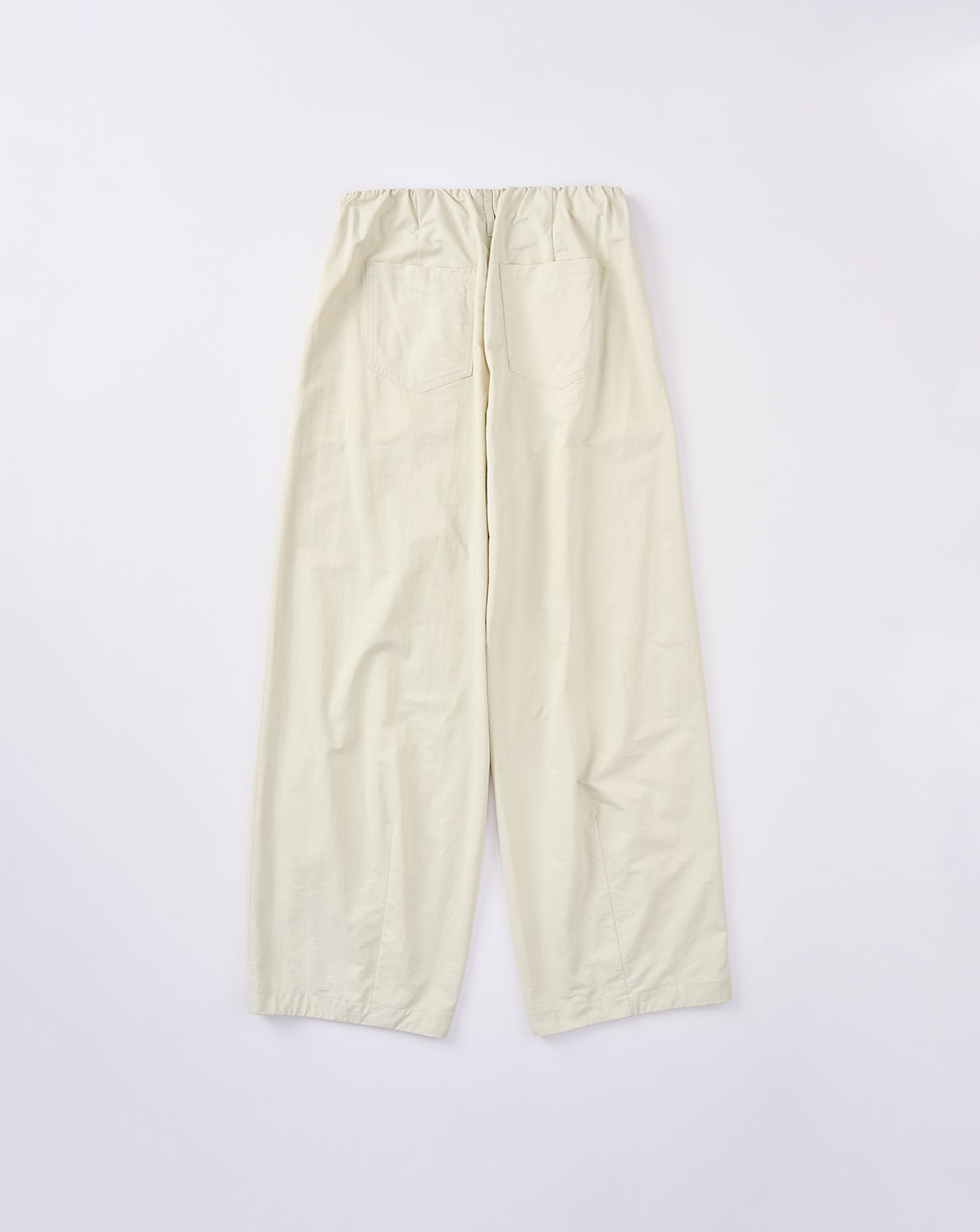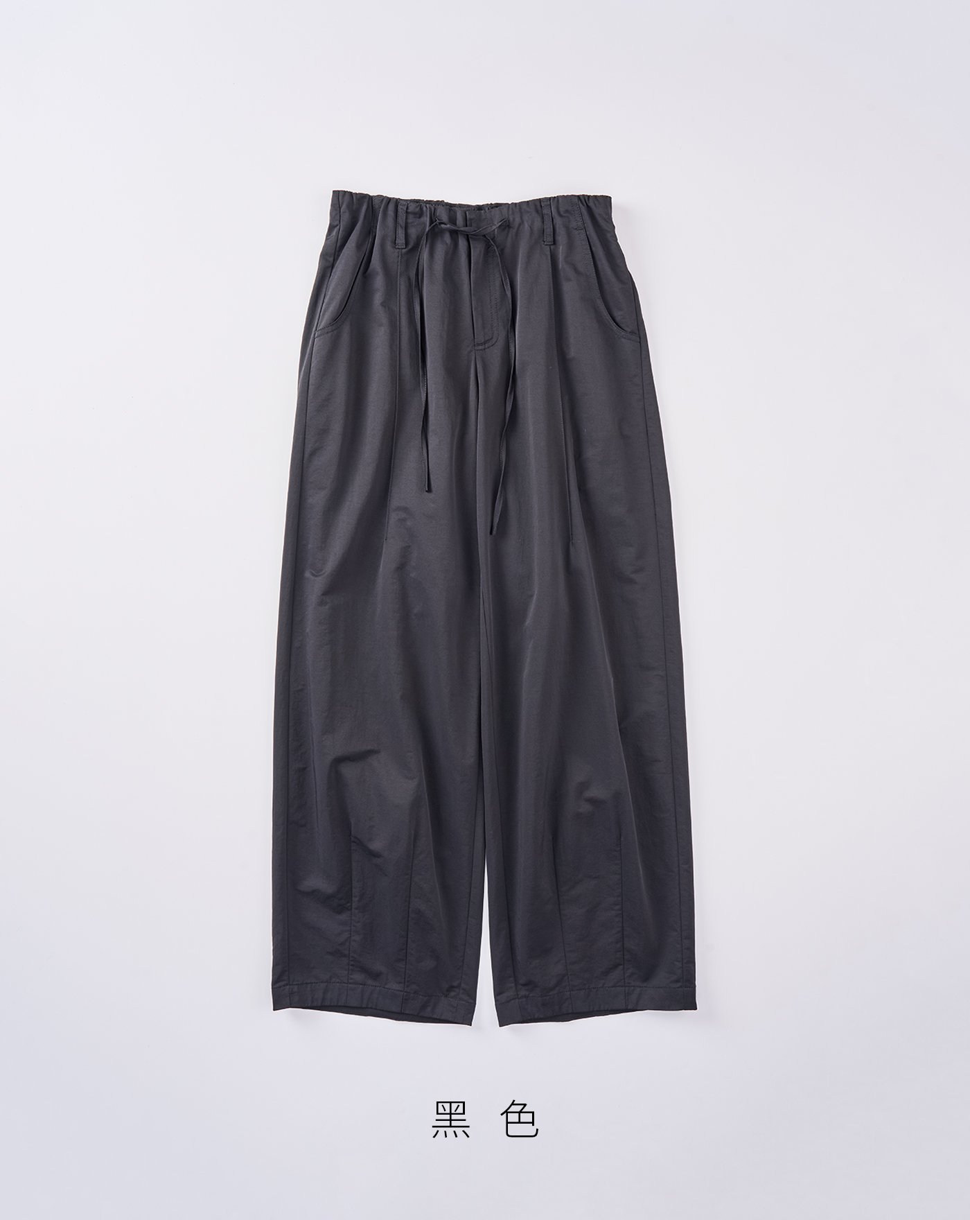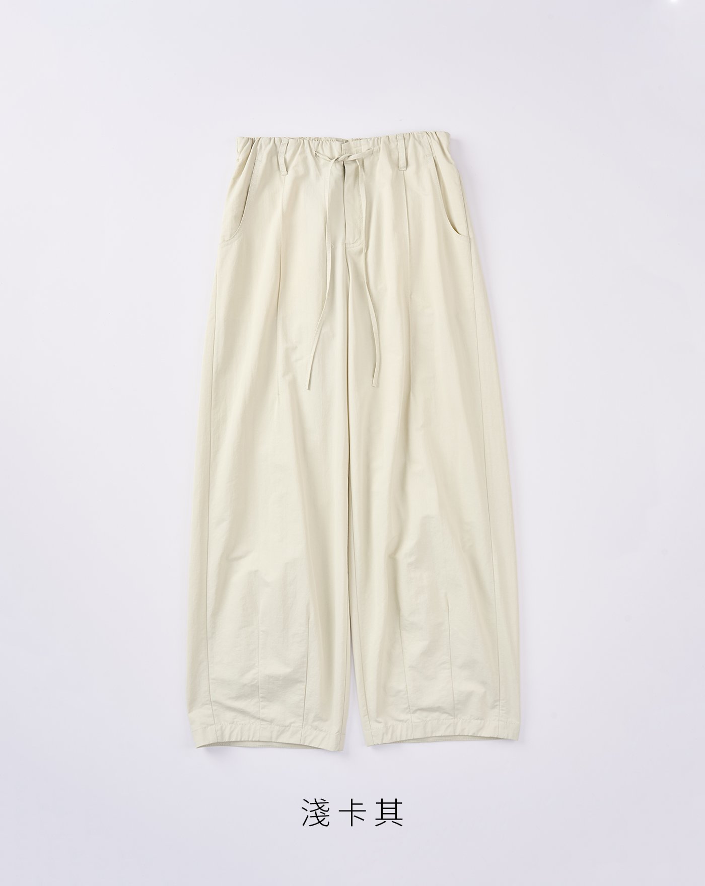 腳口打褶設計呈現出立體繭型縮口造型/腰繩可造型調節