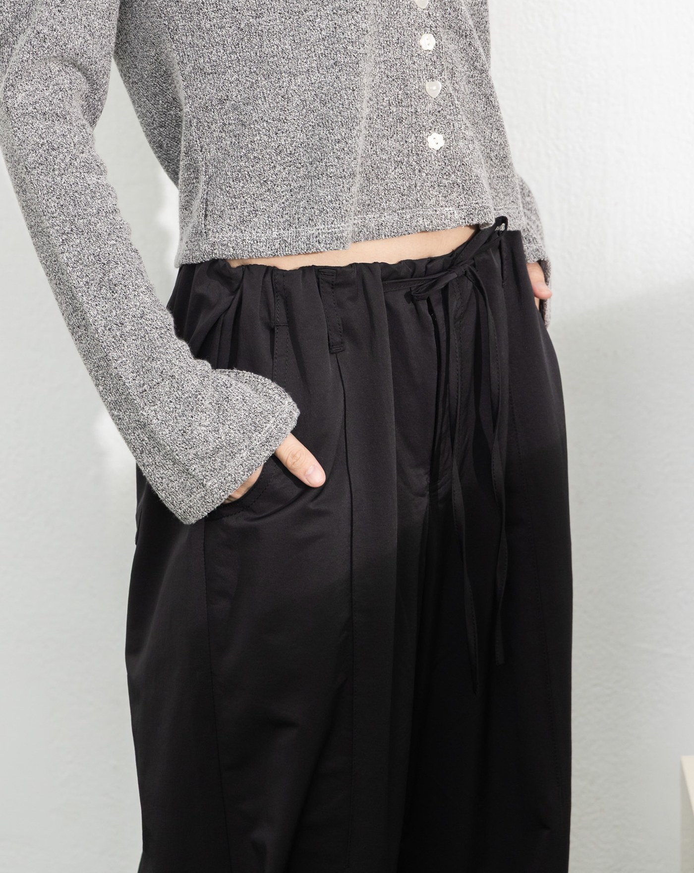 腳口打褶設計呈現出立體繭型縮口造型/腰繩可造型調節