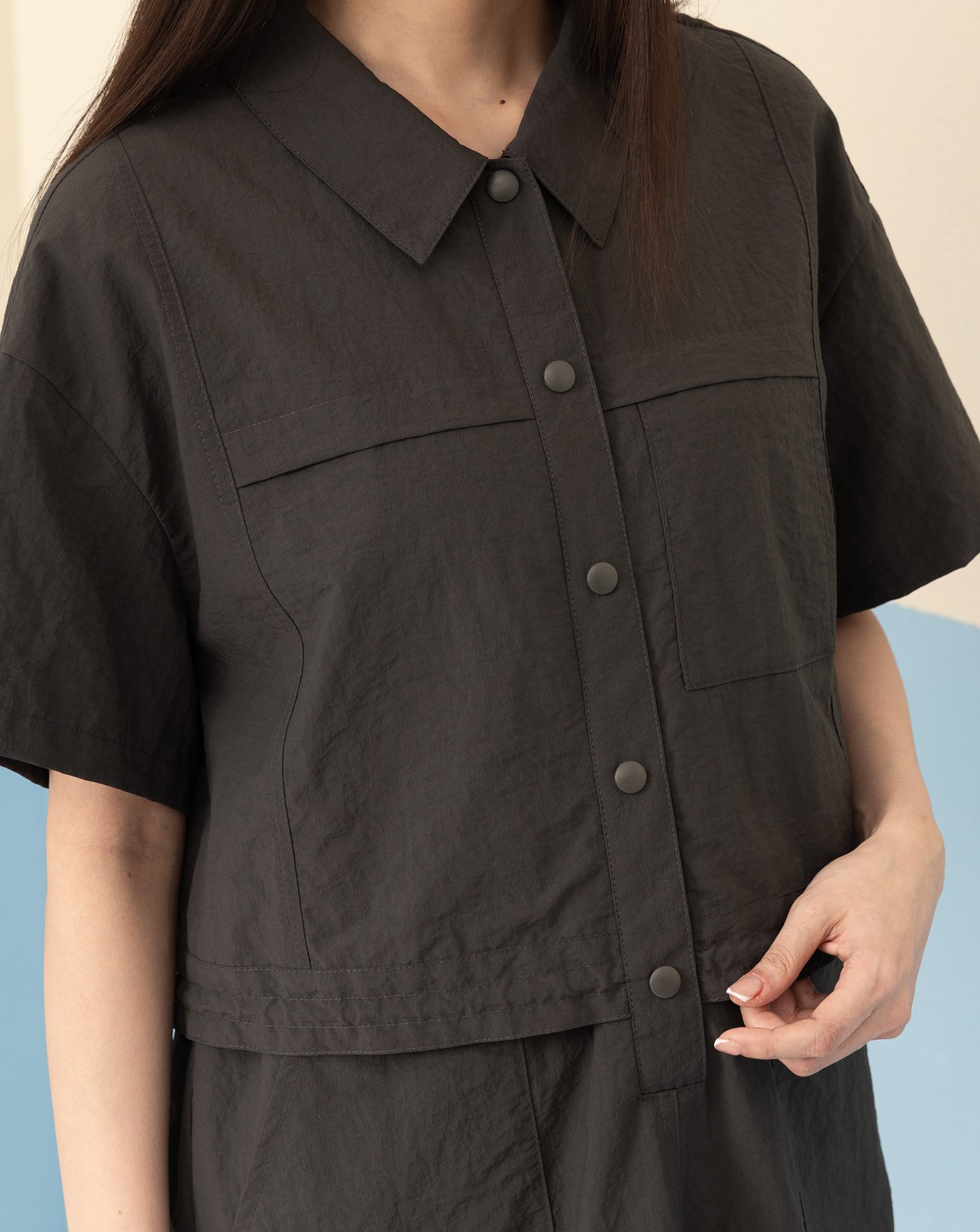 微皺感弧形口袋抽繩造型上衣(兩色)