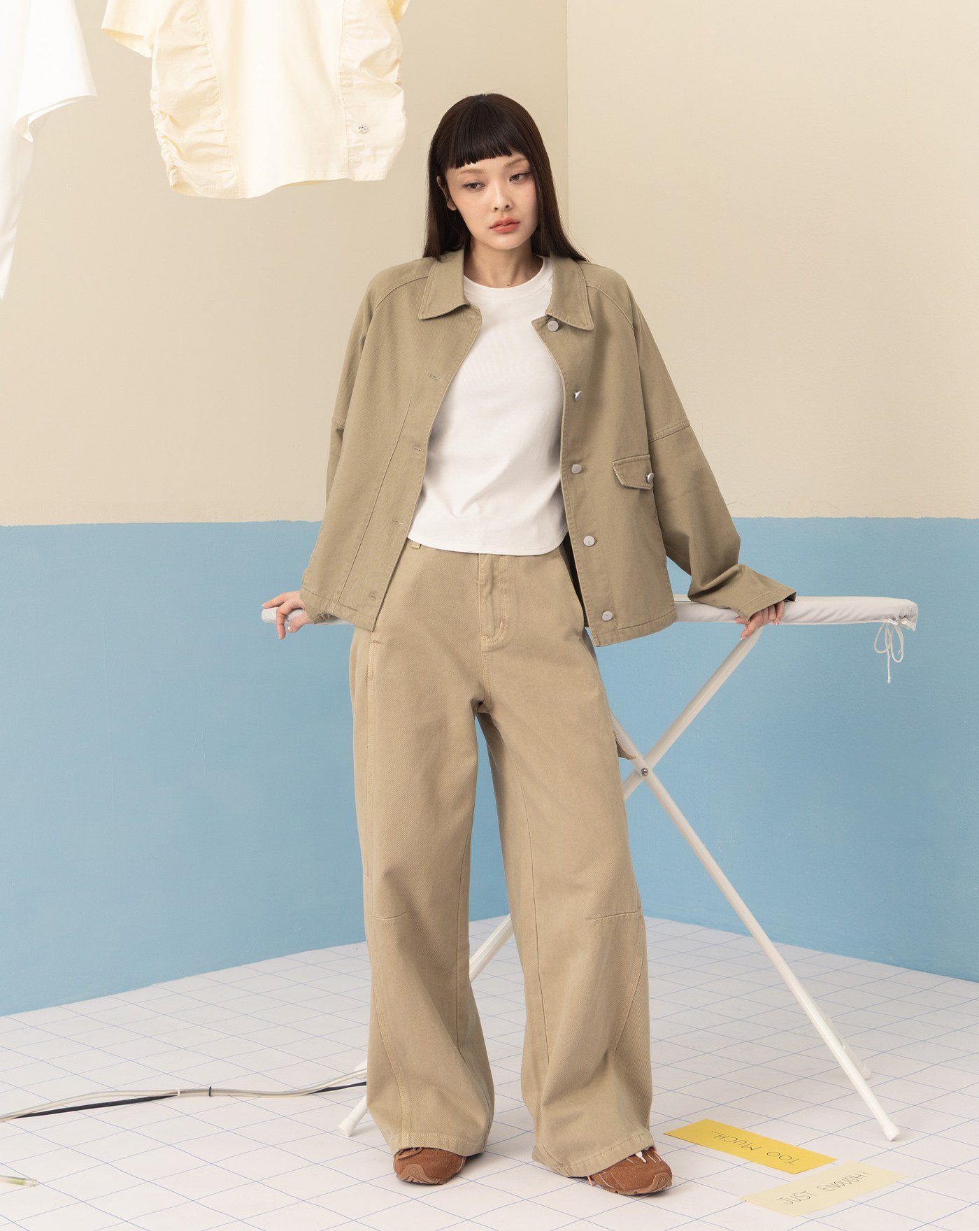 抓褶剪裁牛仔直筒工裝褲